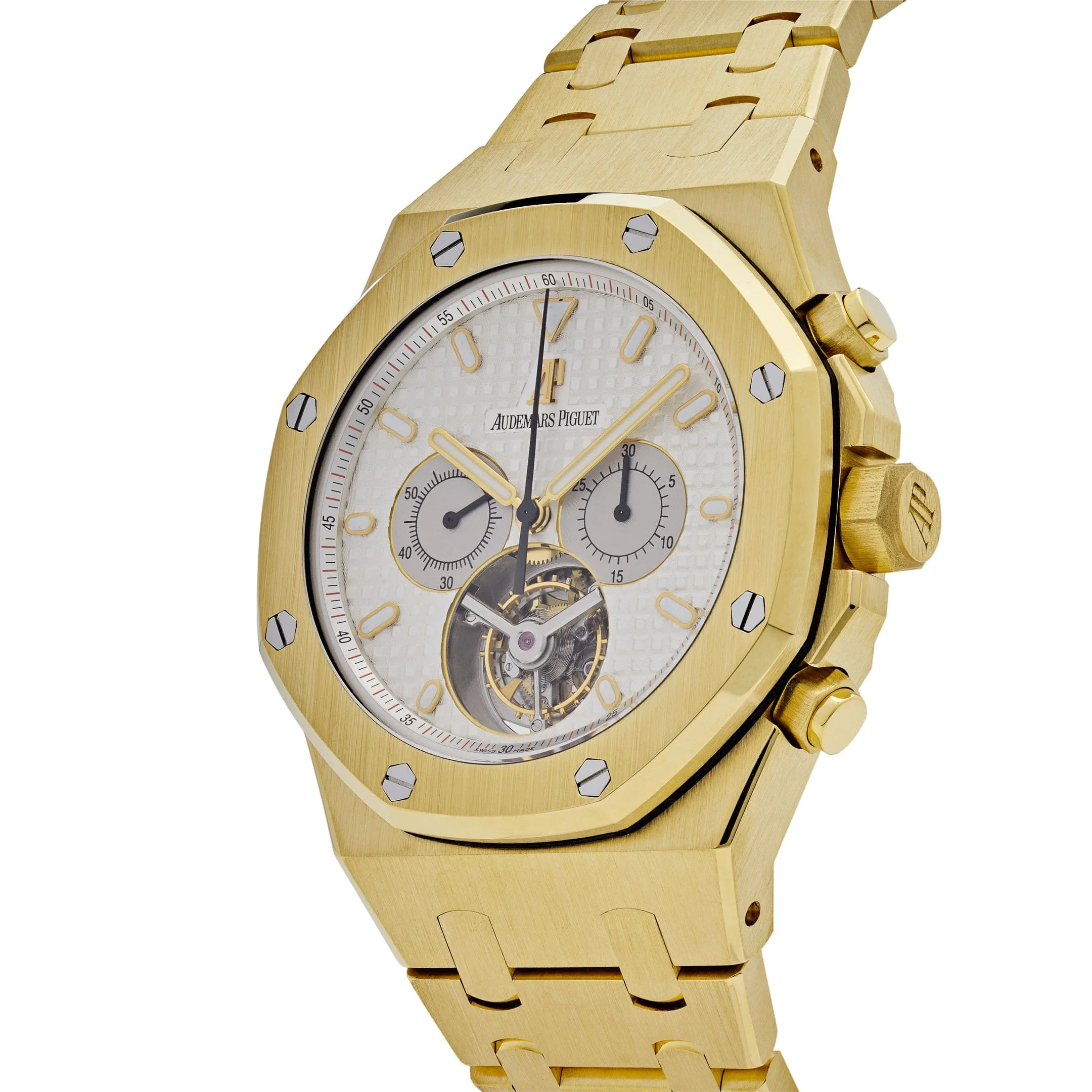 This Royal Oak Tourbillon Chronograph is crafted in a 44mm 18k yellow gold case. The silver tappiserie dial features hour and minute counters, and luminous hour markers. The watch comes on a 18k Yellow Gold bracelet with folding clasp.