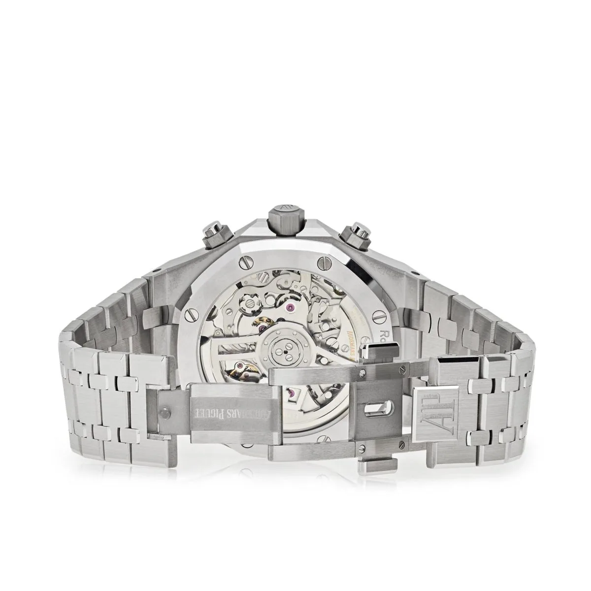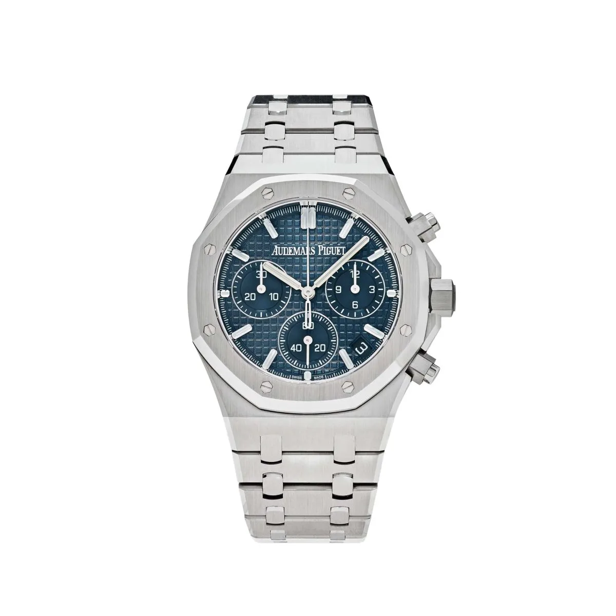 This Royal Oak Selfwinding Chronograph is crafted in a 41 stainless steel case and styled on a steel bracelet. Unique to the brand is the Blue Bleu Suit, Nuage 50 colored dial with the ‘Grand Tapisserie’ pattern. The dial hosts white gold applied stick hour-markers and Royal Oak hands with luminescent coating.