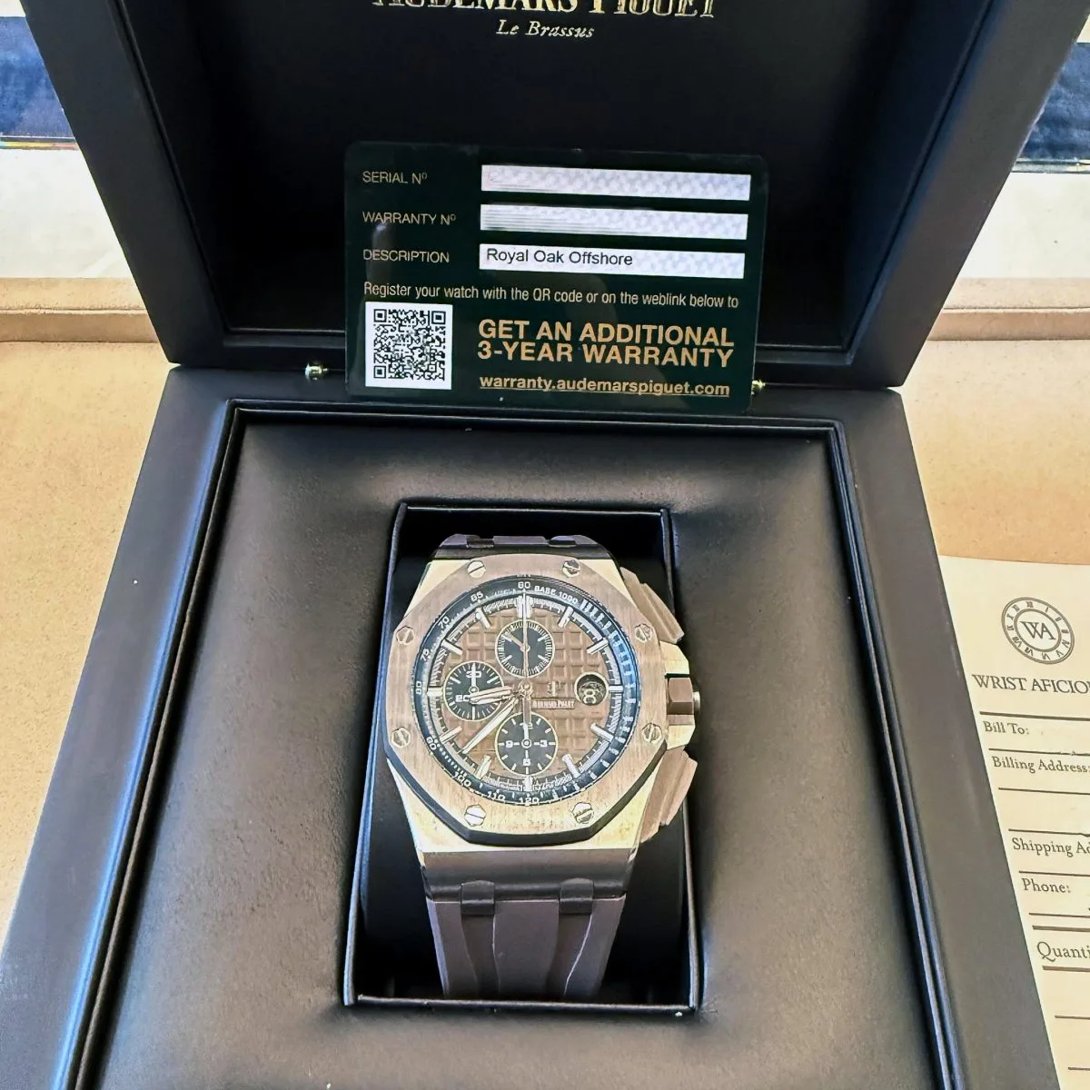 The grey “Méga Tapisserie” dial exudes a modern aesthetic, with contrasting black subdials and luminescent white gold hour markers ensuring excellent readability. The chronograph functionality, along with the date display at 3 o’clock, adds practicality to the design. Paired with a matching grey rubber strap, this timepiece offers comfort and a sporty edge. The combination of titanium’s lightweight properties and the sleek monochromatic palette makes the 26400IO.OO.A004CA.02 a standout piece for collectors who value innovative materials and a distinctive presence on the wrist.