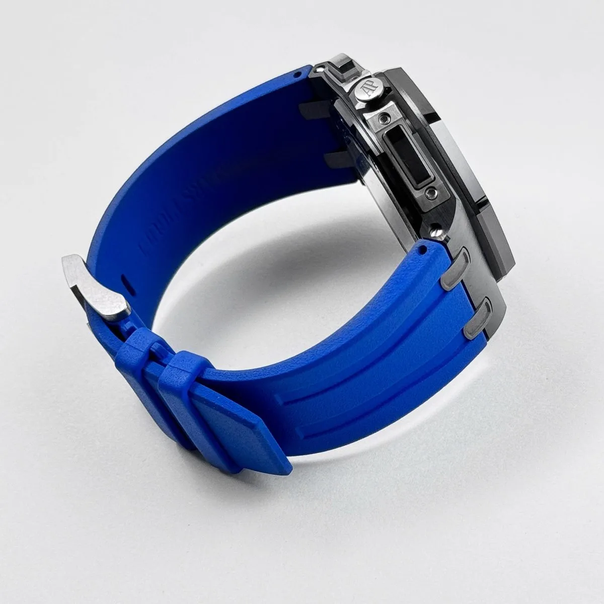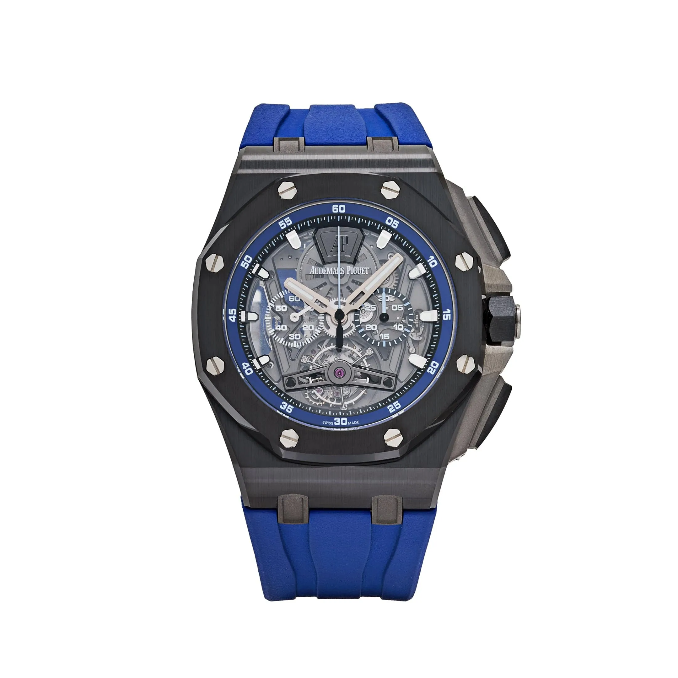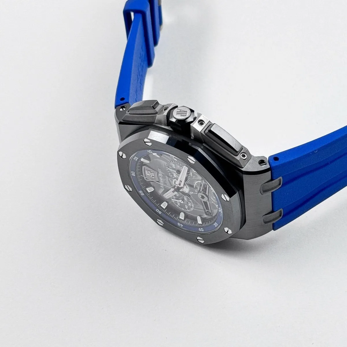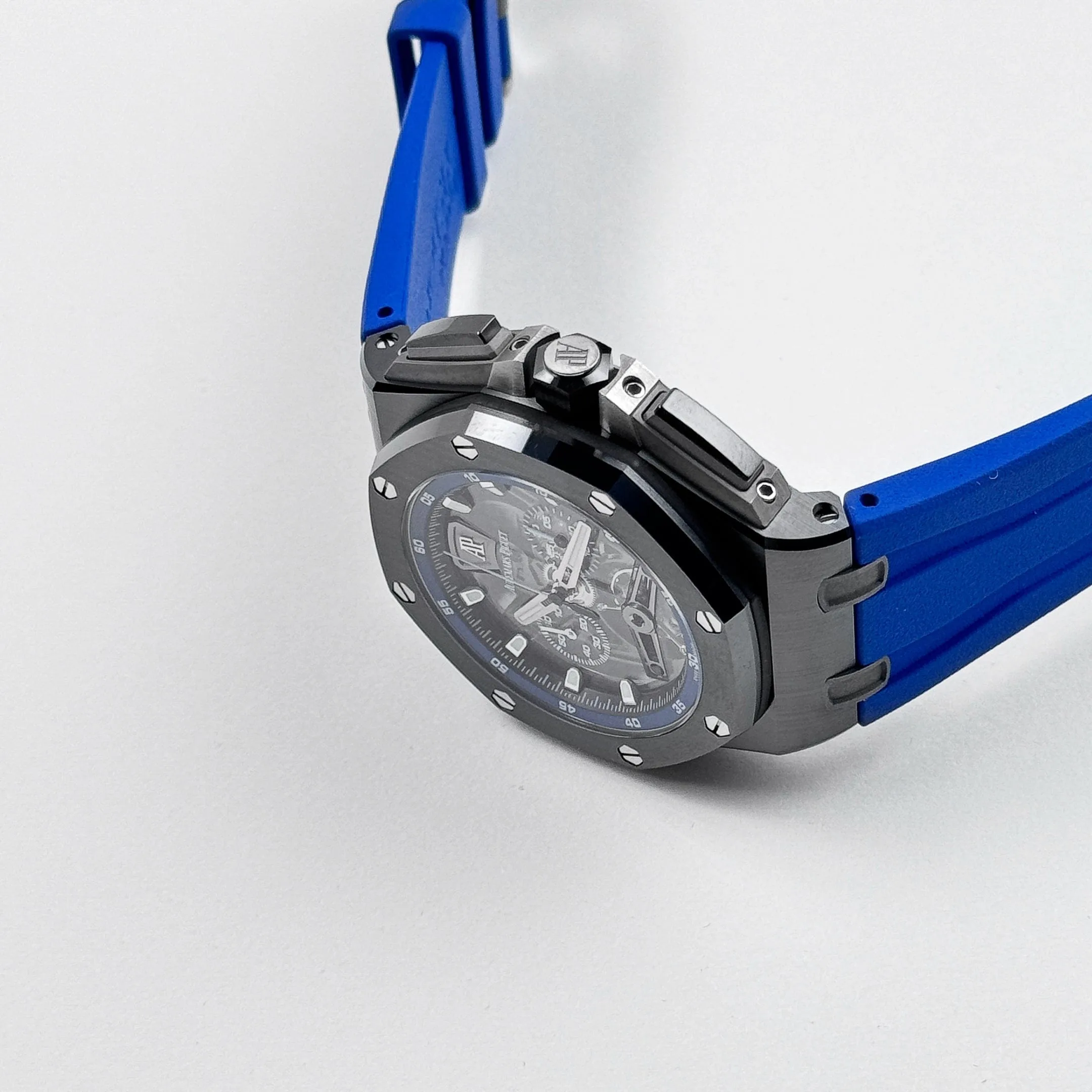 The blue accents on the chronograph subdials and outer minute track add a vibrant contrast to the monochrome case, enhancing legibility while maintaining a sporty aesthetic. The watch is powered by the Caliber 3126/3840, which delivers reliable performance and a robust power reserve. Paired with a blue rubber strap, the 26407CE.OO.A030CA.01 combines avant-garde design, cutting-edge materials, and mechanical excellence—making it a standout piece within the Royal Oak Offshore collection.