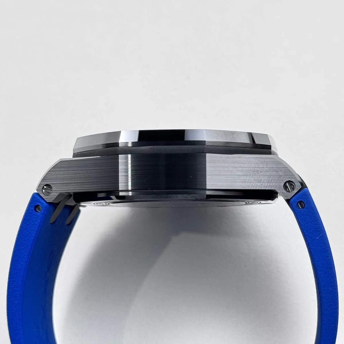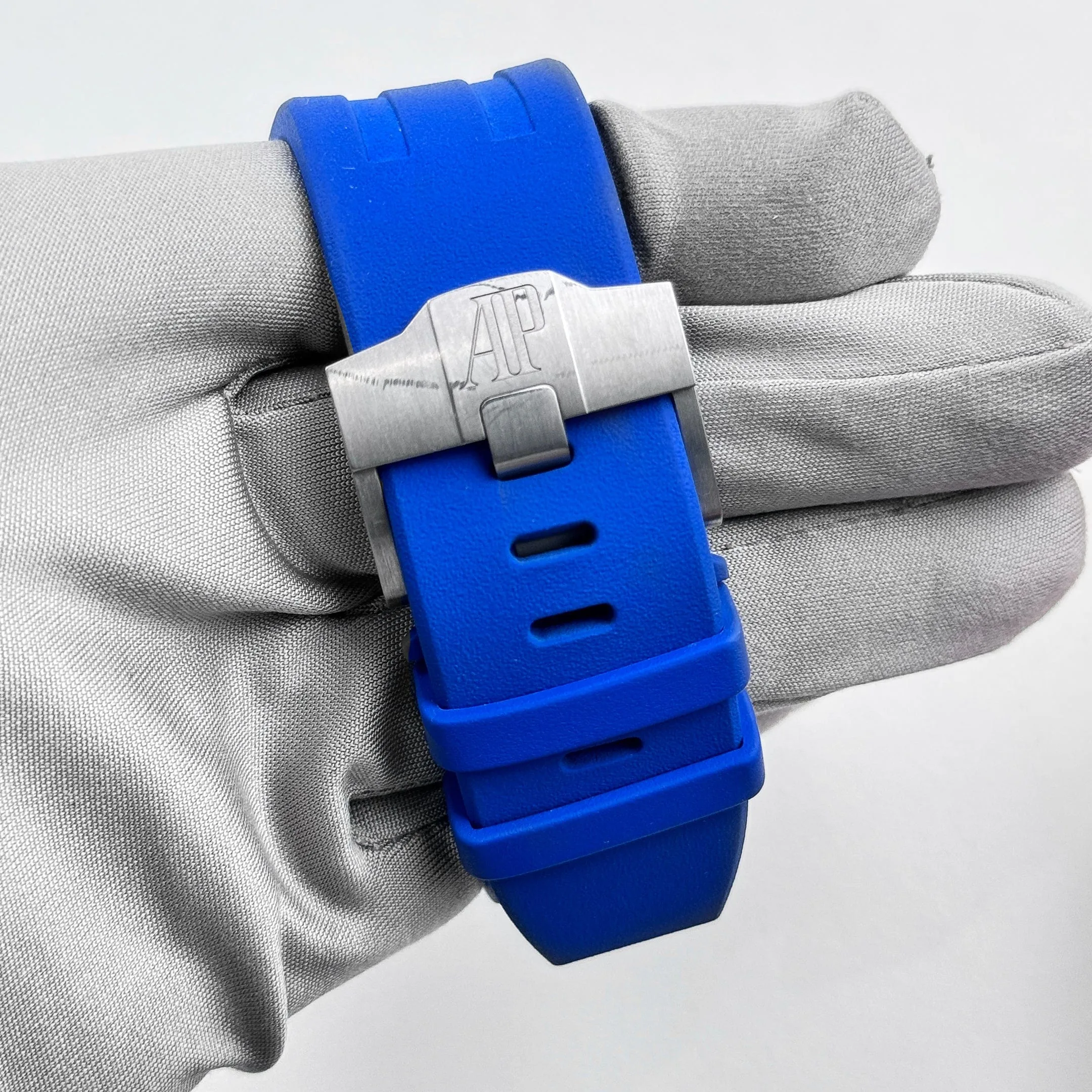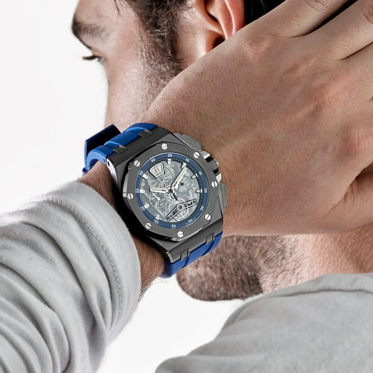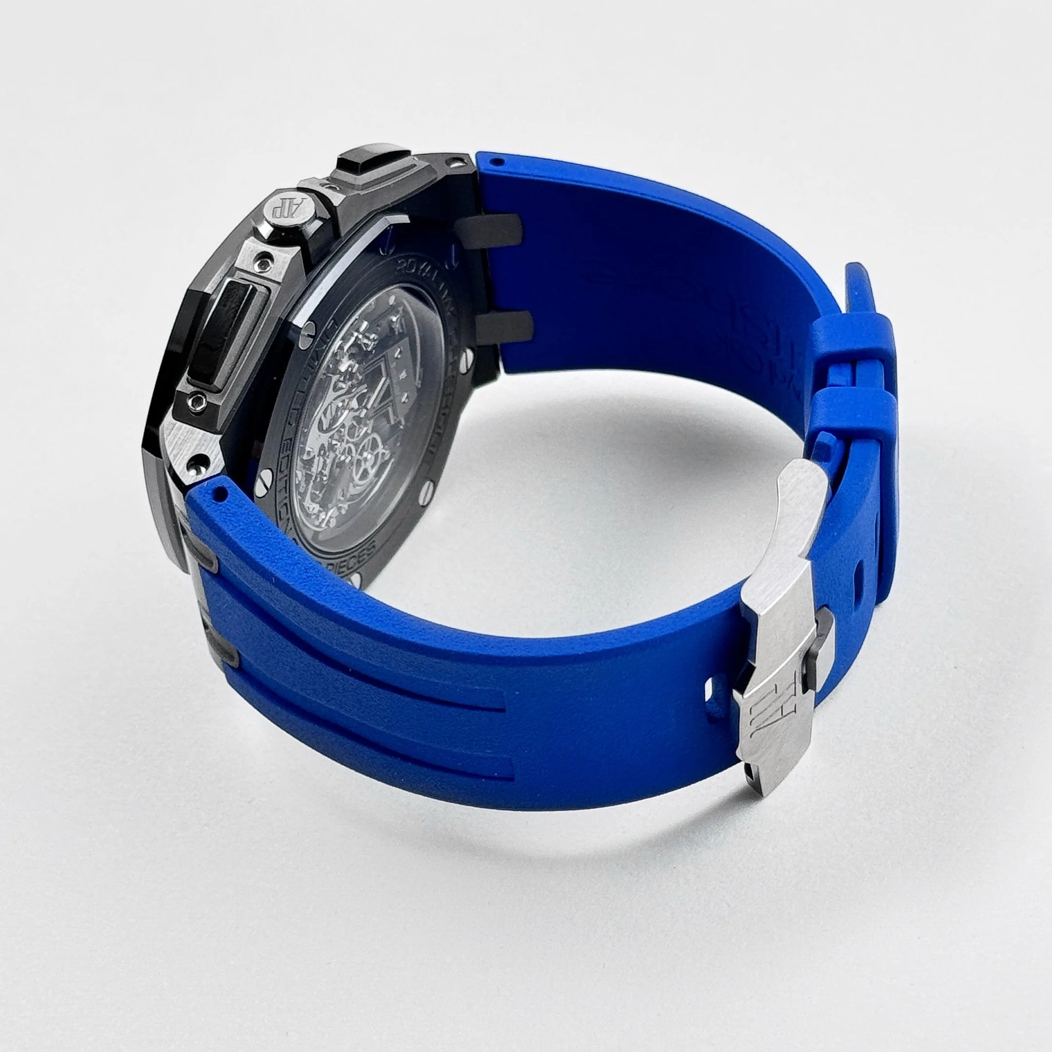 The blue accents on the chronograph subdials and outer minute track add a vibrant contrast to the monochrome case, enhancing legibility while maintaining a sporty aesthetic. The watch is powered by the Caliber 3126/3840, which delivers reliable performance and a robust power reserve. Paired with a blue rubber strap, the 26407CE.OO.A030CA.01 combines avant-garde design, cutting-edge materials, and mechanical excellence—making it a standout piece within the Royal Oak Offshore collection.
