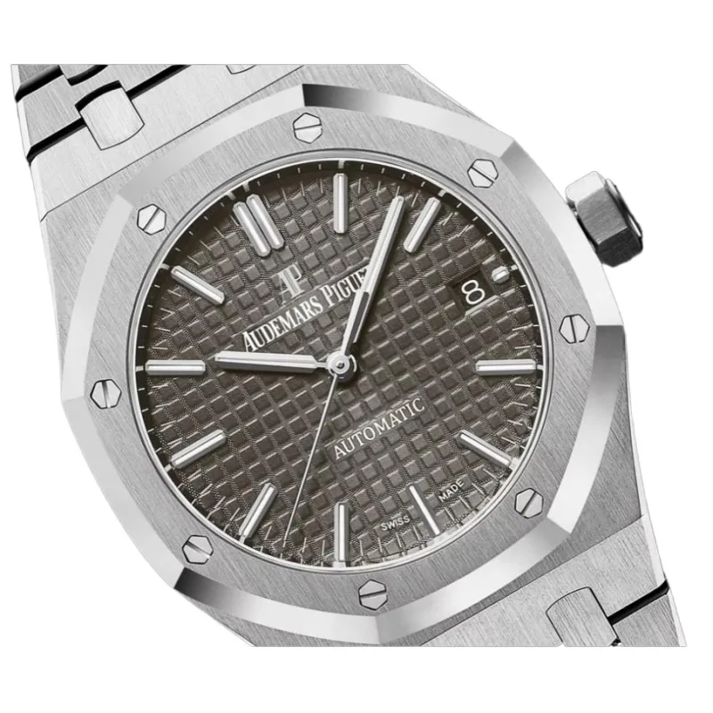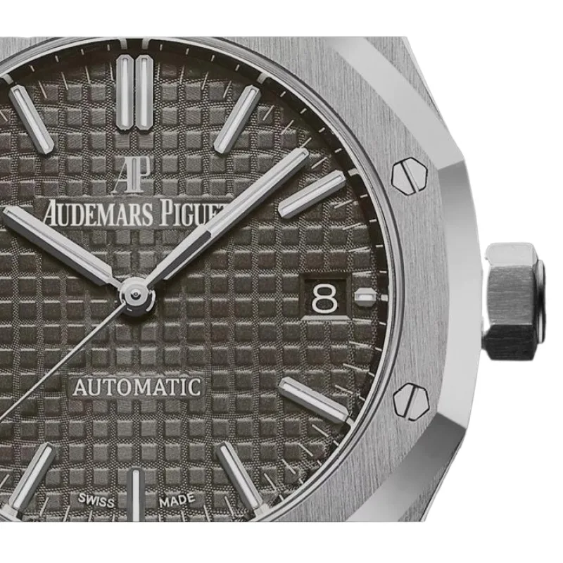 The silver-toned Grande Tapisserie dial adds texture and depth, accented by applied white gold hour markers and Royal Oak hands with luminescent coating for optimal legibility. A date display at 3 o’clock enhances its practicality, blending seamlessly with the clean and symmetrical design.
