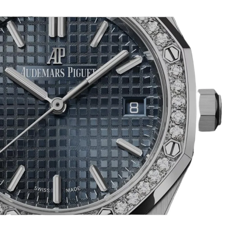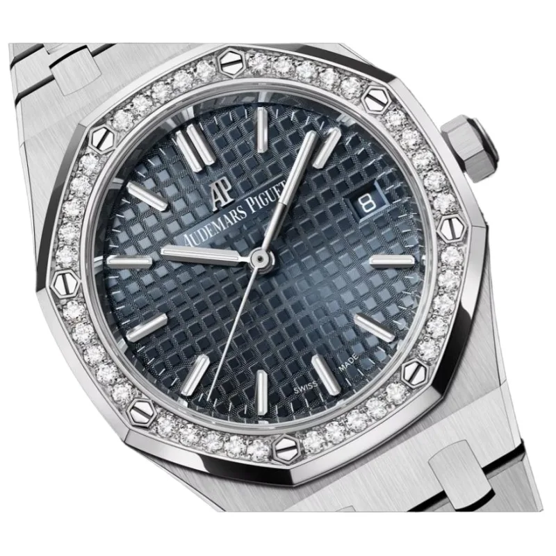 The Audemars Piguet Royal Oak Selfwinding 77351ST.ZZ.1261ST.01 is a stunning ladies’ timepiece that combines the iconic Royal Oak design with luxurious details. Crafted in stainless steel, the 34mm case features the collection’s signature octagonal bezel, adorned with 40 brilliant-cut diamonds, adding an elegant sparkle to its timeless design.
