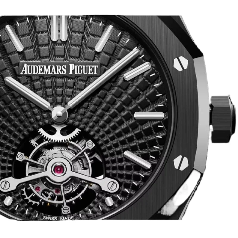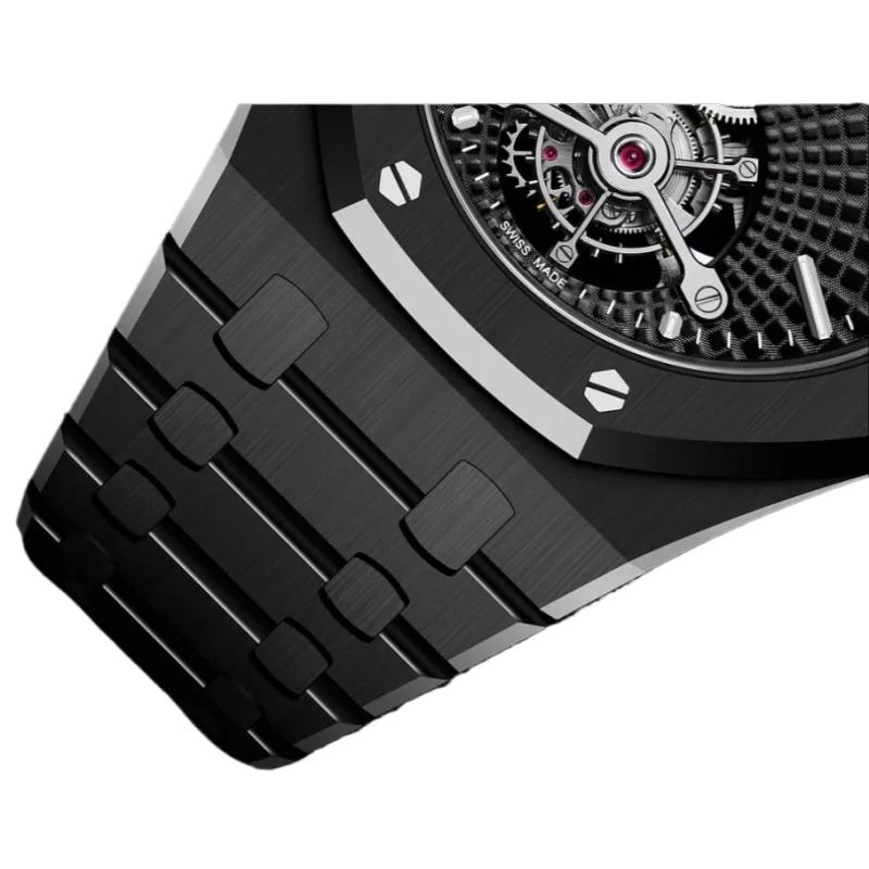 The Audemars Piguet Royal Oak Tourbillon Extra-Thin 26522CE.OO.1225CE.01 is a sleek and innovative timepiece, combining cutting-edge materials with high horology. Crafted entirely from black ceramic, the 41mm case features the iconic octagonal bezel and a mix of satin-brushed and polished finishes, showcasing the refined craftsmanship of the Royal Oak collection.