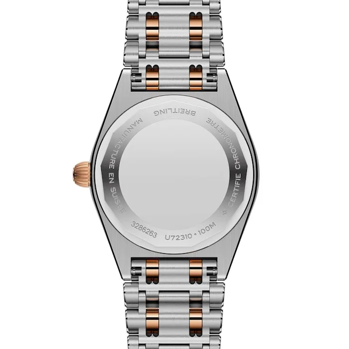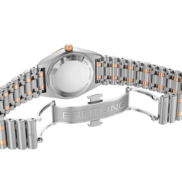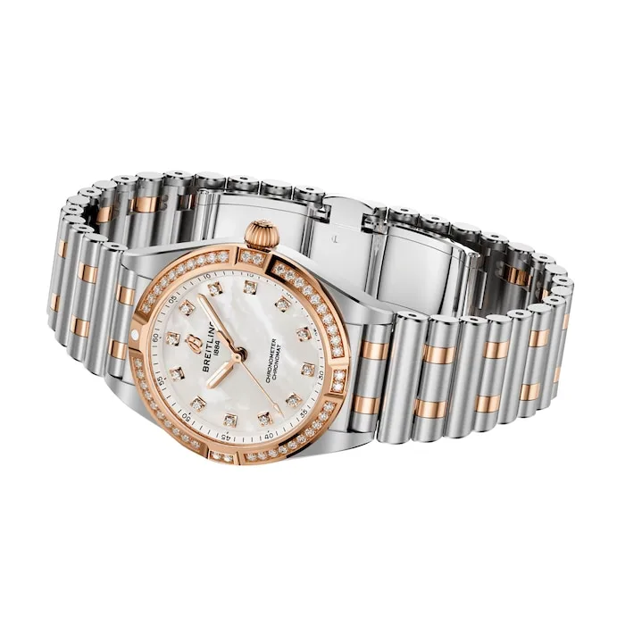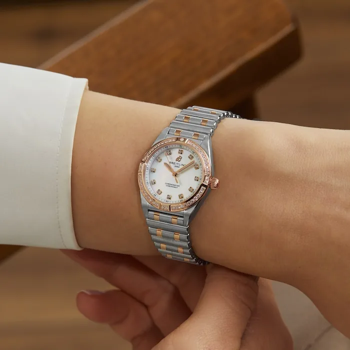 On trend, yet timeless, the petite Chronomat 28 is the versatile sports chic watch for any occasion. These showstoppers have so much more to offer than just their trim new sizes. Mother-of-pearl in various shades and traceable lab-grown diamonds combine with subtle refinements to give the timepieces a jewelry-like appeal. Choose your case and Rouleaux bracelet style: from straight-up stainless steel to mixed-metal duotone—all with a comfortable butterfly folding clasp. The Chronomat 28 is powered by the Breitling Caliber 72, a COSC-certified SuperQuartz™ chronometer.