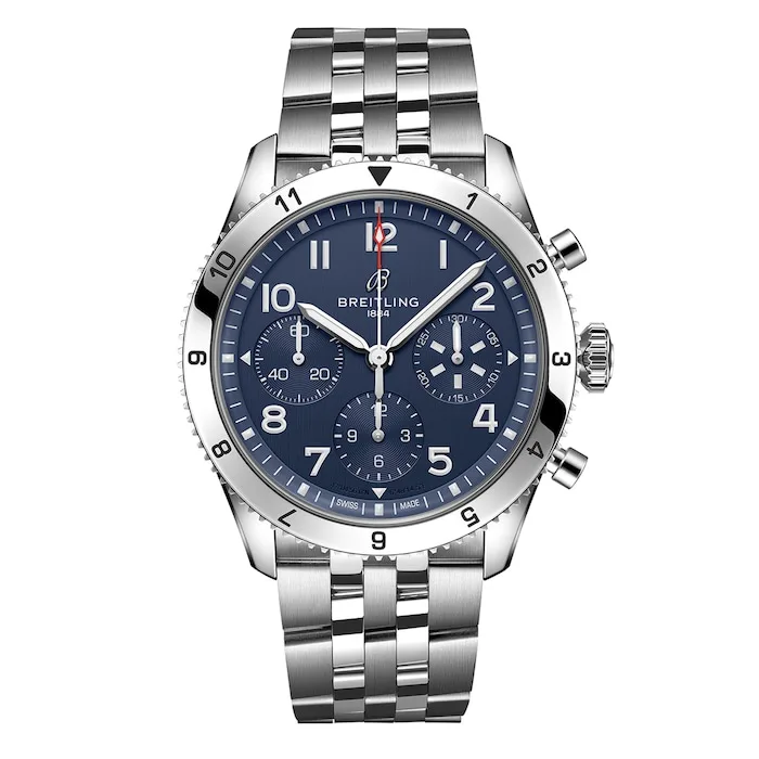 Housed in a 42mm stainless steel case, the classic blue dial is enhanced by three chronograph sub-dials, large, highly legible Arabic numerals, and a red-tipped seconds hand.