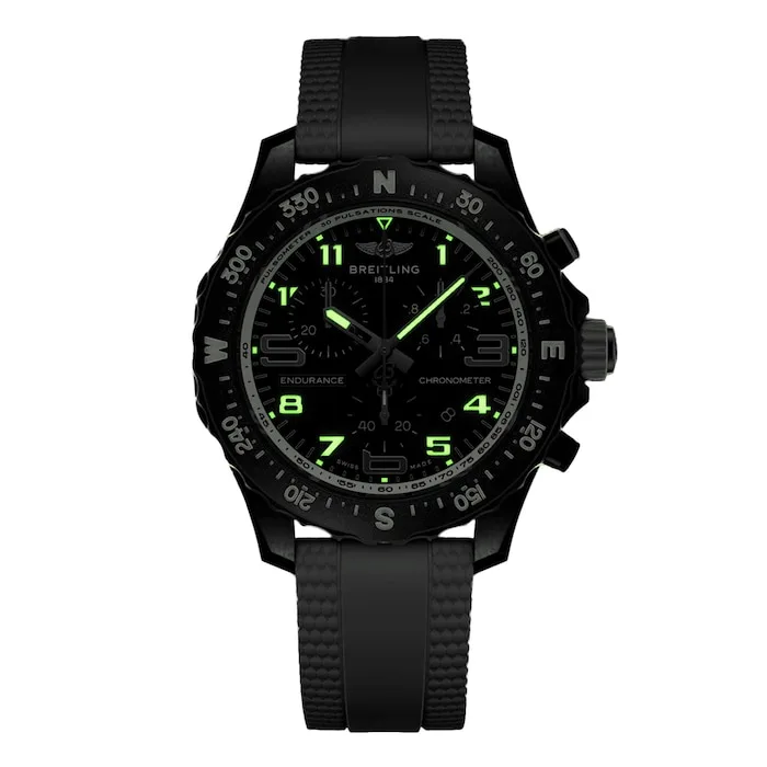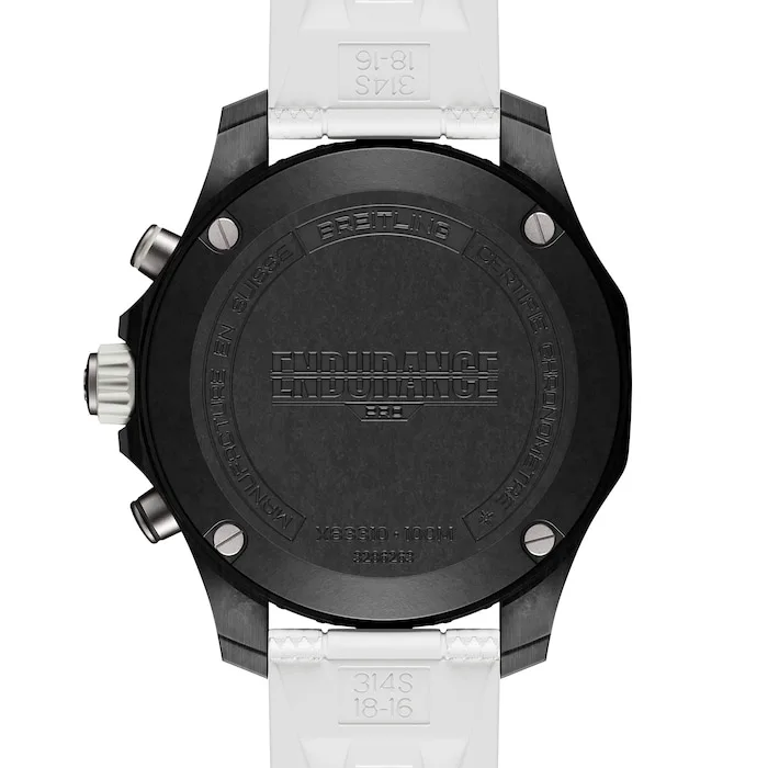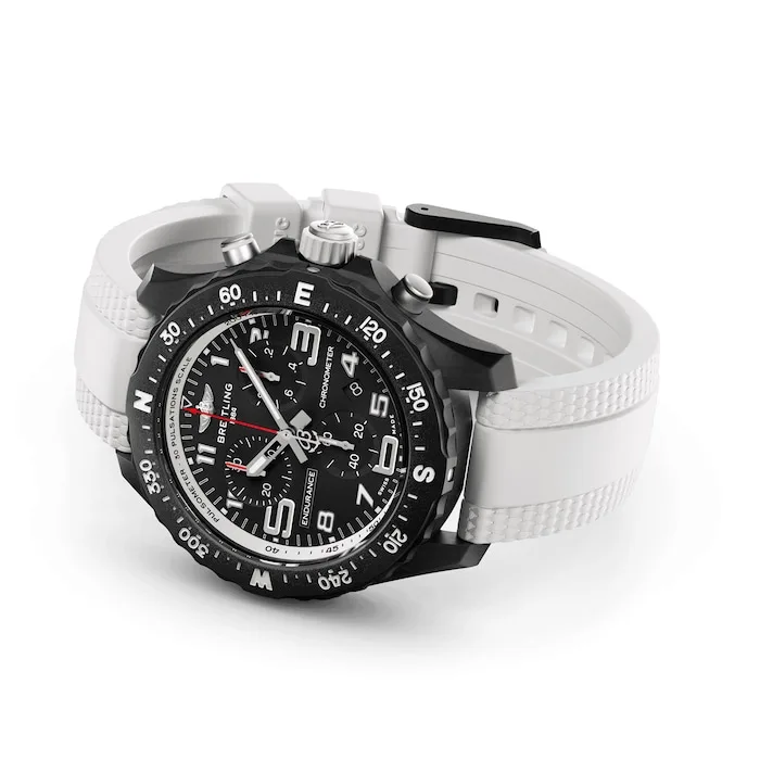 The Endurance Pro features an ultra-light Breitlight case, a robust material 3.3 times lighter than titanium and 5.8 times lighter than stainless steel. Non-magnetic, thermally stable and hypoallergenic, Breitlight is highly resistant to scratches, traction and corrosion. It also has a feel that is warmer than metal and slightly textured effect, accentuating the originality of the design. Exclusive to Breitling, the material is 100-percent Swiss-made.