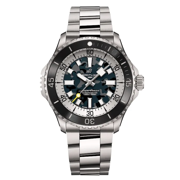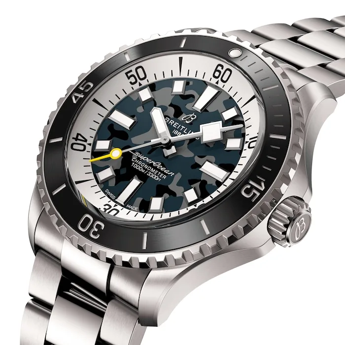 Designed to perform on land and beneath the waves, the Superocean Automatic Super Diver retraces the Slow Motion’s celebrated design codes, adding modern features such as a scratch-proof matt ceramic-inlayed bezel and camouflage dials.