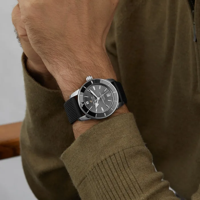 Breitling’s 1950s-era SuperOcean dive watch was designed in response to the rise of professional and leisure scuba diving. In 1957, Breitling took the plunge into the undersea world with two pioneering dive watches called the SuperOcean the world’s first dive chronograph. Today’s Superocean Heritage combines vintage-inspired design cues with modern craftmanship, it features signature details like the iconic triangular-shaped hands and a unidirectional polished black ceramic bezel. Its tonal lacquered anthracite dial in subtle contrast to the black ceramic bezel creates an alluring play of light, adding depth and refinement to the design.