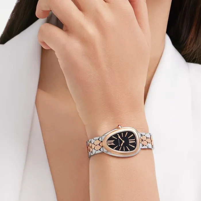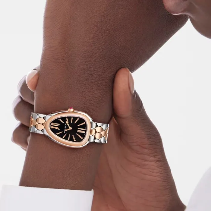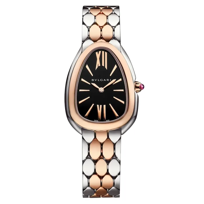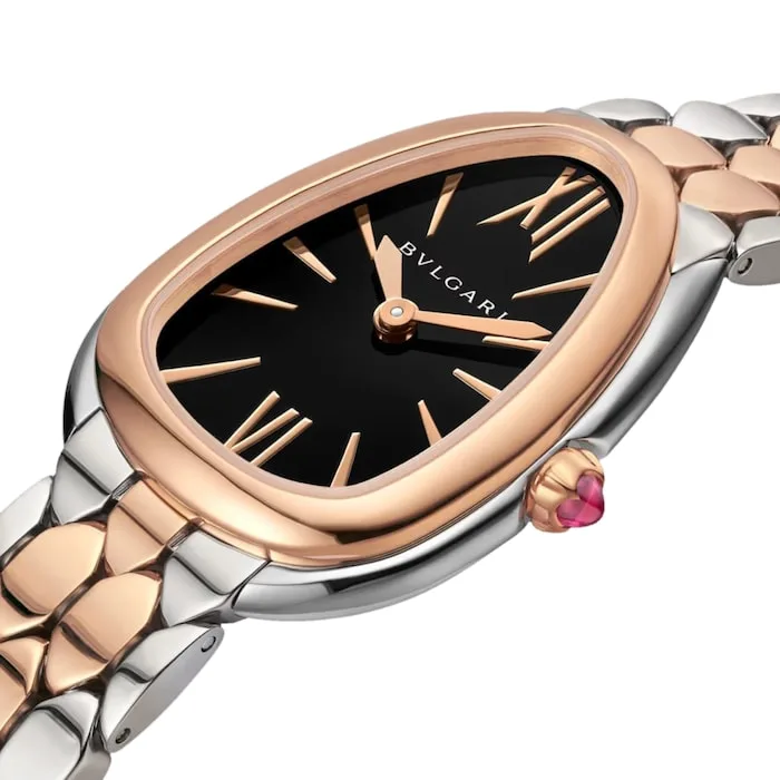 Gleaming with the refined sheen of its materials, the Serpenti Seduttori watch in 18 kt rose gold and stainless steel is an irresistible blend of sensuality, mystery and contemporary glamour. With its black lacquered dial, framed by the distinctive drop shaped watch head, the timepiece boasts an alluring game of contrasts. Inspired by the serpent’s scales, the flexible and enveloping bracelet features a hexagonal pattern, sealing the perfect encounter between the world of jewellery and watchmaking. Serpenti Seduttori watch with quartz movement, 33 mm stainless steel case, 18 kt rose gold bezel, 18 kt rose gold crown set with a cabochon-cut pink rubellite, black lacquered dial, stainless steel and 18 kt rose gold bracelet with folding buckle. Water-resistant up to 30 metres.