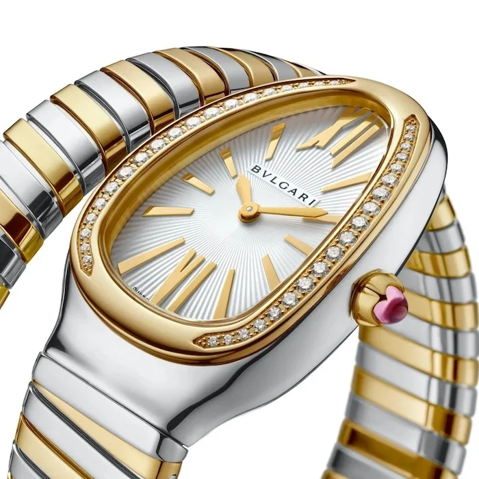 Merging two of the most iconic emblems of Bulgari’s design, the Serpenti Tubogas single-spiral watch in 18 kt yellow gold and stainless steel embellished with diamonds coils the sinuosity of the snake with the contemporary soul of tubogas. Crafted with a flexible and tubular litheness, the timepiece evokes both the seductive power of the serpent and the fluid shape of its wrapping body, fusing irresistible glamour with distinctive jewellery design.