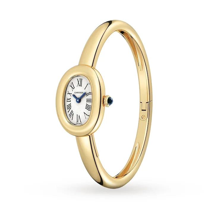 Baignoire de Cartier watch, mini model, size 15, quartz movement. Yellow gold 750/1000 case. Yellow gold 750/1000 beaded crown set with a sapphire cabochon. Yellow gold 750/1000 rigid bracelet. Silvered dial, blued-steel sword-shaped hands, sapphire crystal. Length: 24.6 mm, width: 18.7 mm, thickness: 7.2 mm. Water-resistant up to 3 bar (approx. 30 metres).