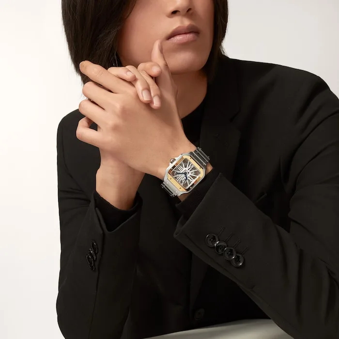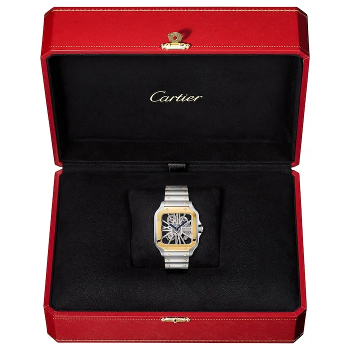 Santos Skeleton watch, large model, Manufacture mechanical movement with manual winding, calibre 9611 MC. Steel case, yellow gold 750/1000 bezel, 7-sided crown set with a faceted sapphire, blued-steel sword-shaped hands, sapphire crystal case back. Steel bracelet with SmartLink adjustment system. Second strap in veal leather, with double adjustable folding steel buckle. Both bracelets are fitted with the QuickSwitch interchangeability system. Hours and minutes with skeletonised bridges forming Roman numerals. Individually numbered movement consisting of 138 parts including 20 rubies. Movement dimensions: 28 mm x 28 mm, movement thickness: 3.97 mm, balance: 28,800 vibrations/hour, power reserve approx. 72 hours. Case width: 39.7 mm, thickness: 9.08 mm. Water-resistant to 10 bar (approx. 100 metres/330 feet).