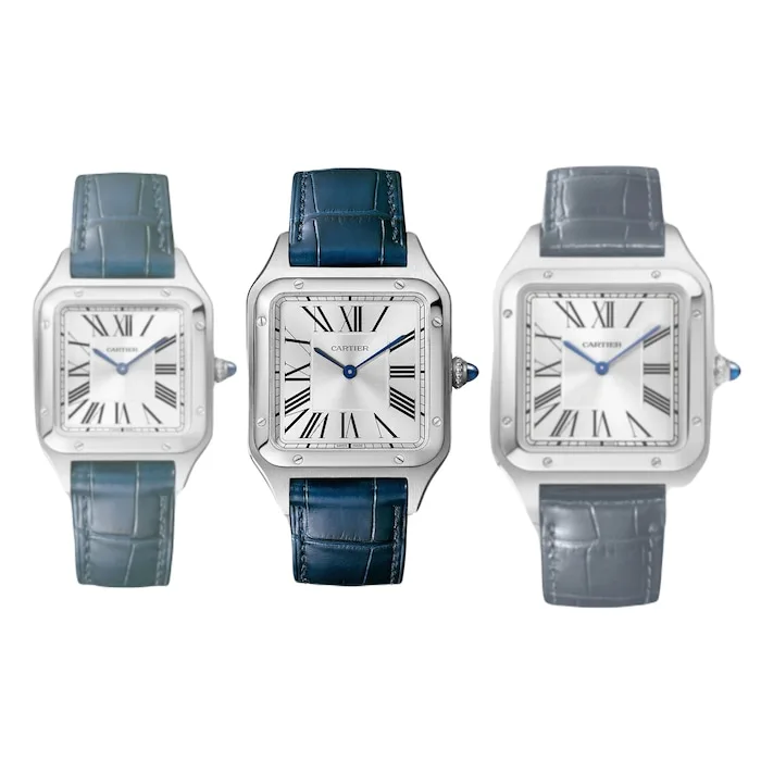 Santos-Dumont watch, large model, high autonomy quartz movement (~ 6 years). Steel case, beaded crown set with a blue synthetic cabochon-shaped spinel, satin-brushed silver dial with sunray effect, Roman numerals, blued-steel sword-shaped hands, sapphire crystal. Strap in navy blue alligator leather, with steel ardillon buckle. Case dimensions: 43.5 mm x 31.4 mm, thickness: 7.3 mm. Water-resistant up to 3 bar (approx. 30 meters/100 feet).