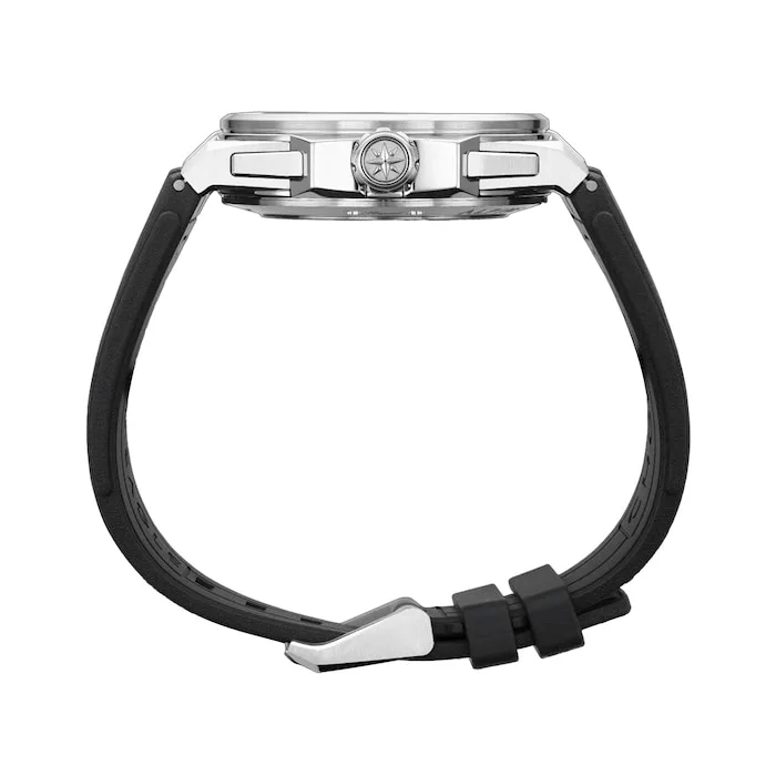 The robust Lucent Steel A223 case is secured with a dynamic black rubber strap. The black textured dial showcases three distinctive chronometers, with luminescent-filled hands and hour markers, a tachymeter and a date window for exceptional timekeeping.