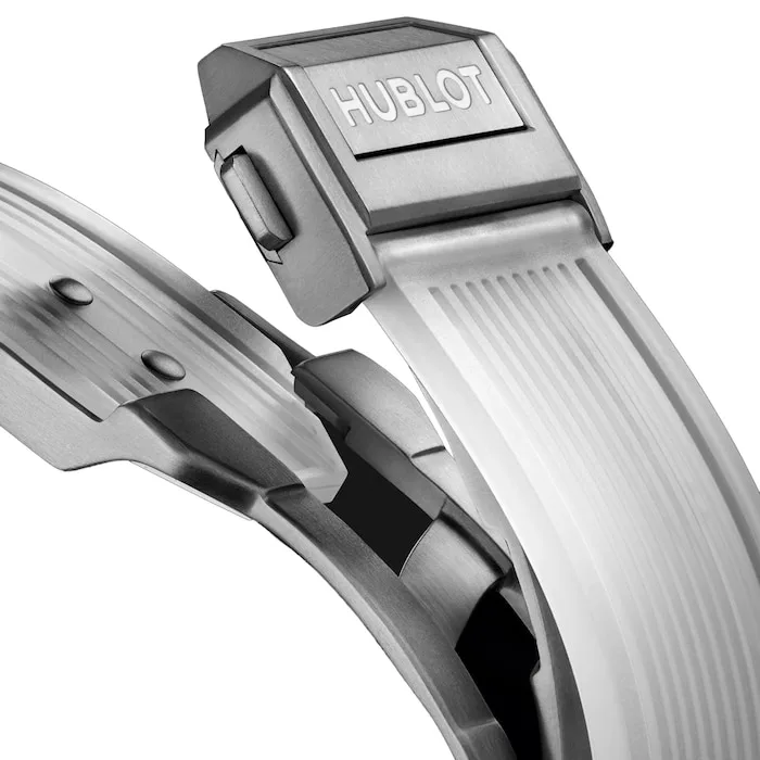 The comfortable white rubber strap exudes a clean and fresh aura. Water resistant up to 5 bar (50 metres), this timepiece is a perfect example of the hybrid fusion between art and technology Hublot is famed for.