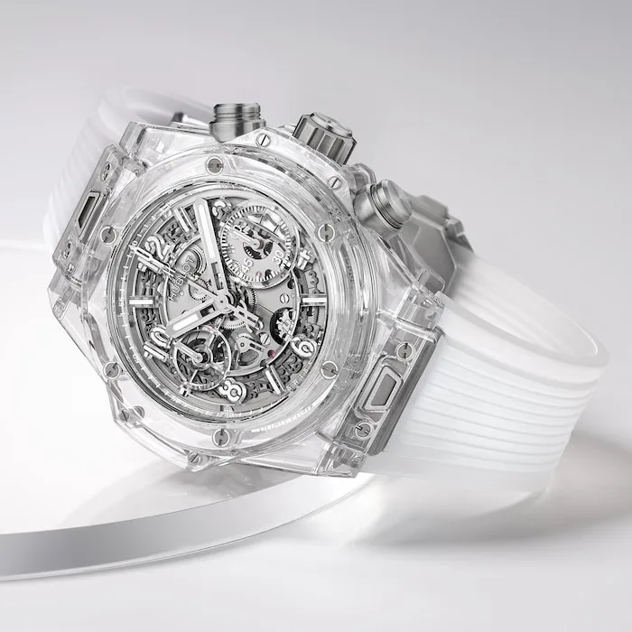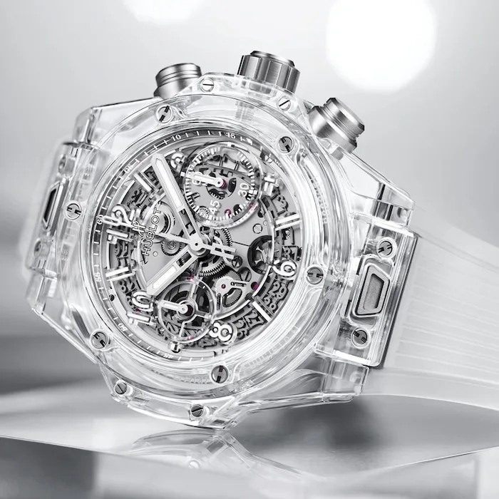 Durable and made for long-term wear, this 42mm model features an innovative crystal clear case, developed by Hublot engineers and chemists for optimal clarity and robust durability.