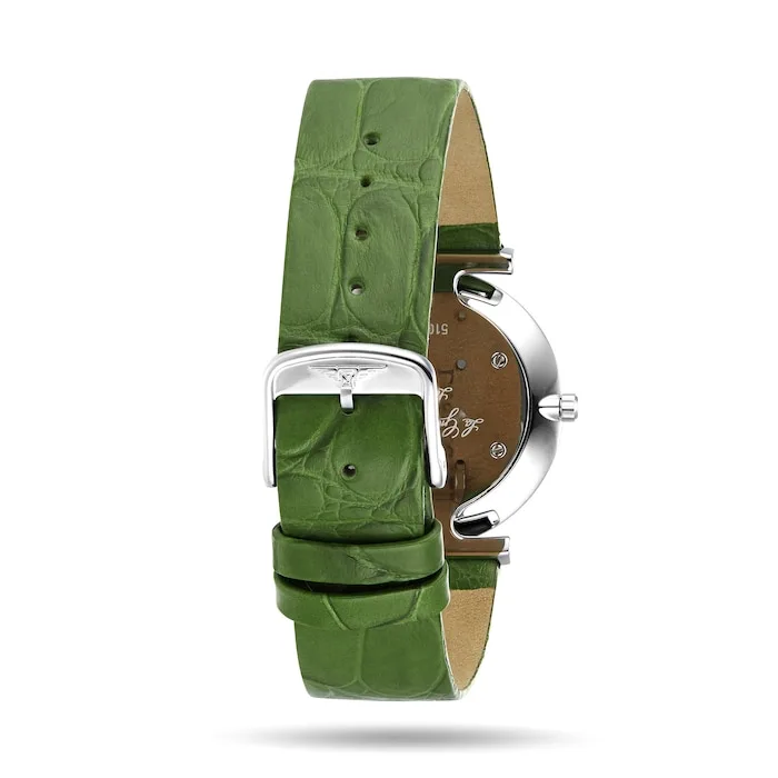 • 29mm stainless steel case paired with a green alligator leather strap