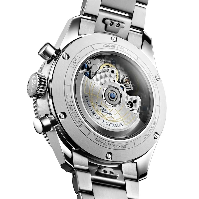 Certified by COSC, this chronometer is powered by the L791 automatic movement and benefits from a 68 hour power reserve. The transparent case back reveals the movement at work, including a personalised weight, engraved with the Longines Spirit collection globe.