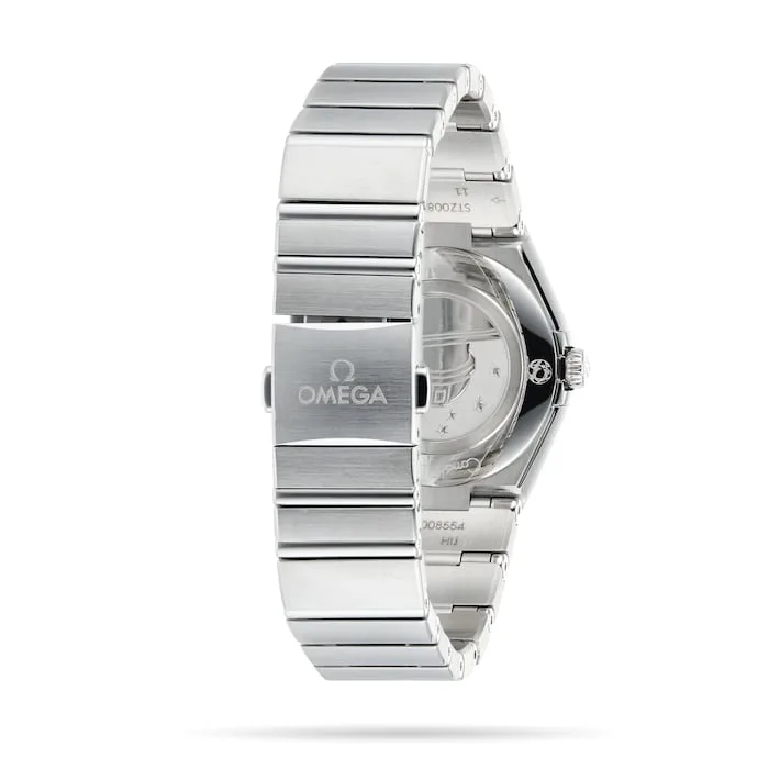 This elegant, 28mm timepiece features a stainless steel case, paired with a matching stainless steel bracelet.
