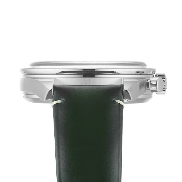 This 40.50mm model features a stainless steel case, paired with a rich green leather strap.