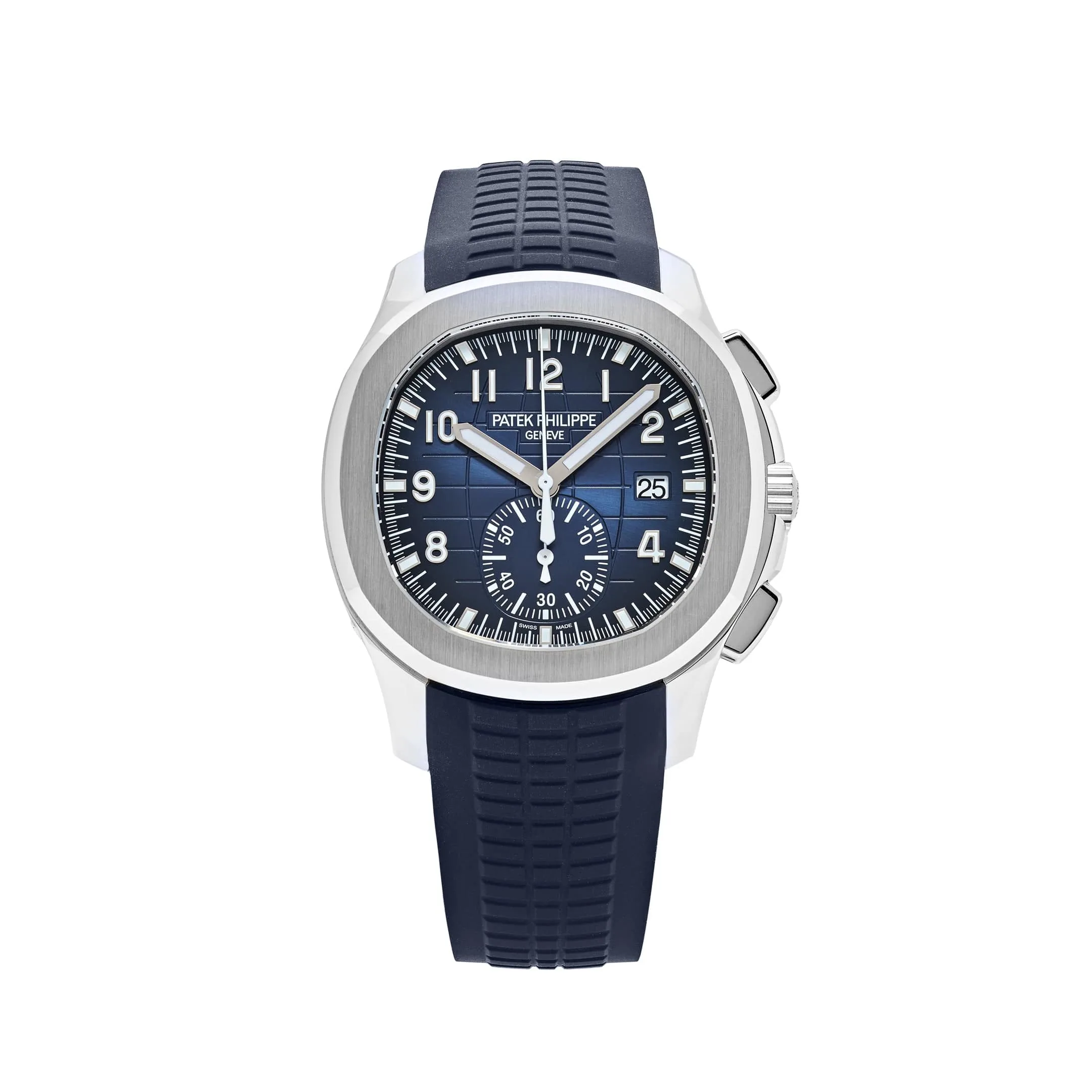 The textured blue dial, featuring the signature Aquanaut grid pattern, is complemented by white gold-applied hour markers and luminescent-coated hands for excellent legibility. The integrated flyback chronograph is both practical and elegant, with a 60-minute counter at 6 o’clock and a subtle date display for added utility.