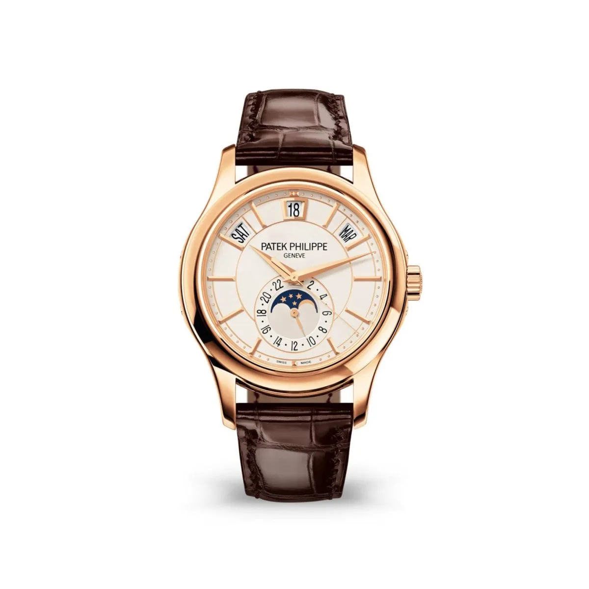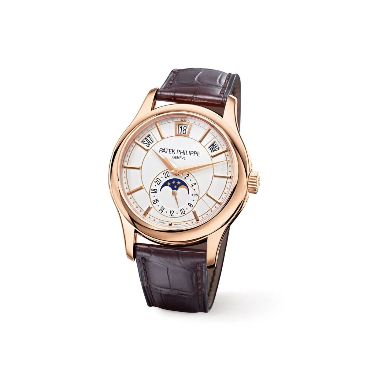 Paired with a hand-stitched chocolate brown alligator leather strap and secured by a rose gold fold-over clasp, the 5205R-001 is a versatile and elegant choice for collectors. This timepiece embodies Patek Philippe’s mastery in creating practical yet sophisticated complications, making it a standout addition to any collection.