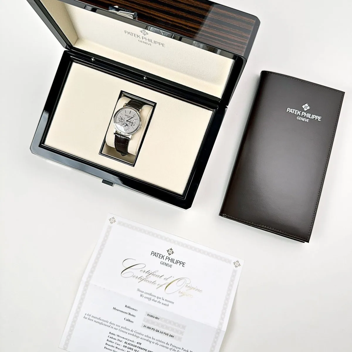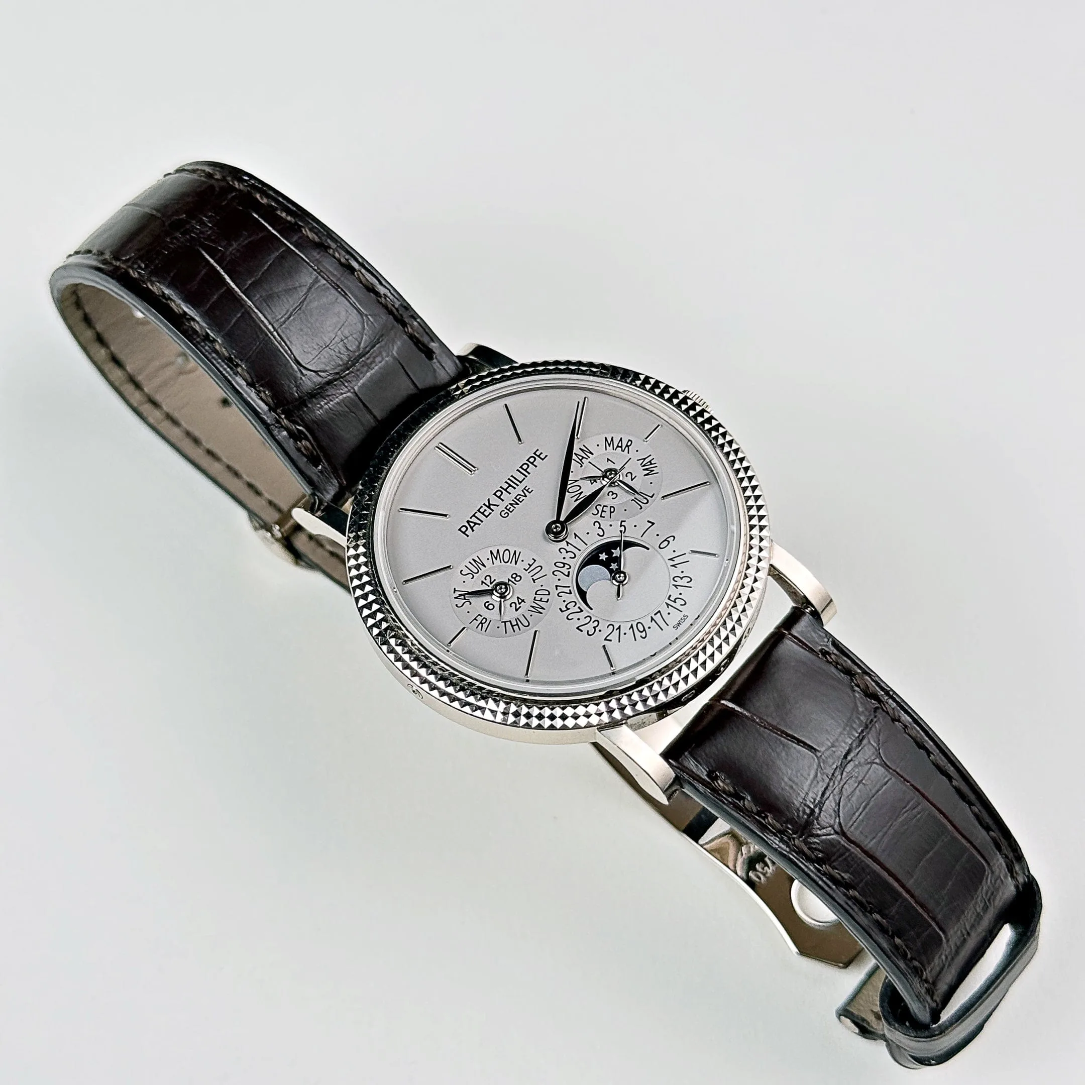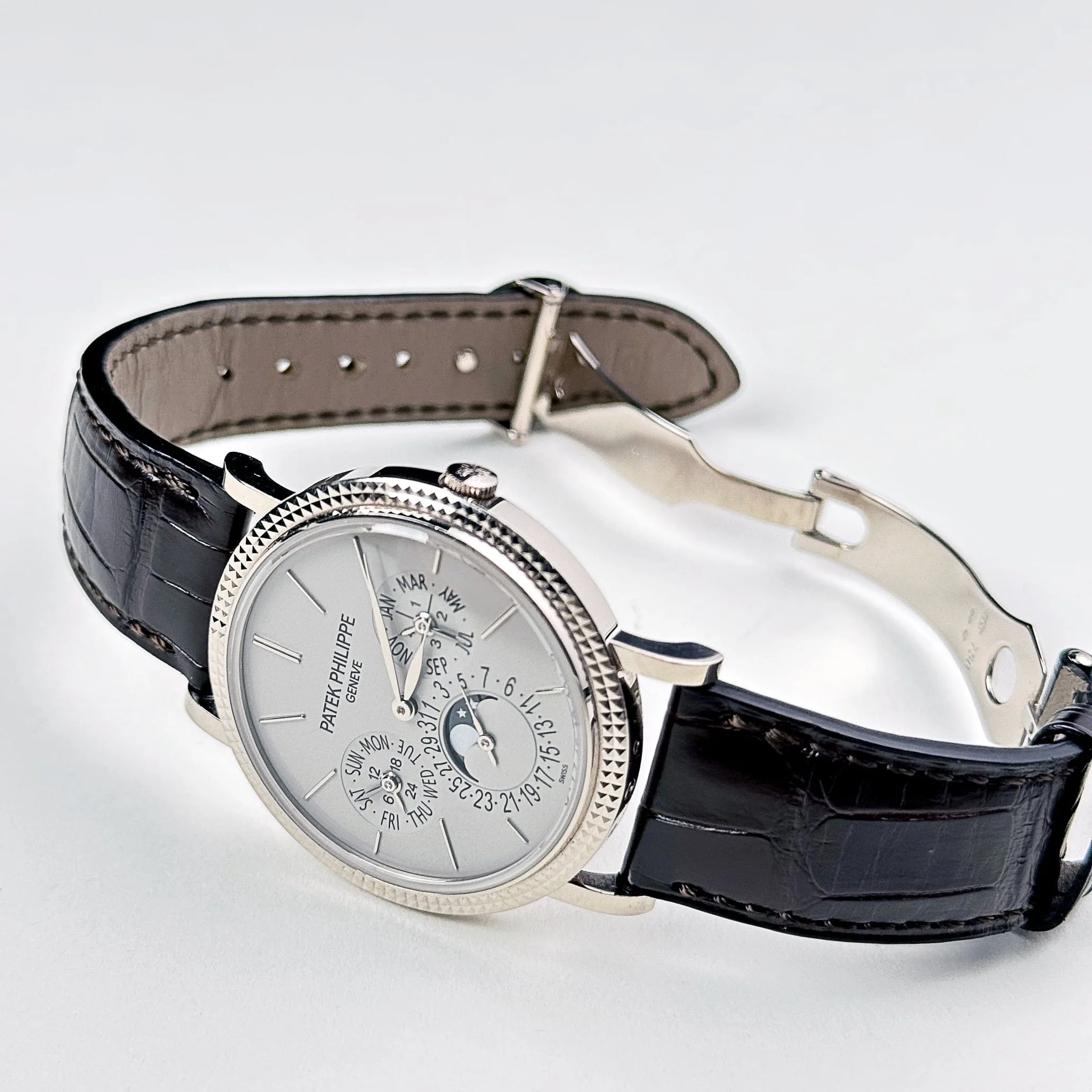 The Patek Philippe Grand Complications 5139G-001 Perpetual Calendar in white gold with a silver dial is a refined timepiece that combines classic elegance with advanced horology. The white gold case complements the subtle silver dial, which features a full perpetual calendar complication, offering precise tracking of the date, day, month, and moon phase. This model is highly sought after for its rarity and exceptional craftsmanship, making it a coveted piece for collectors who value both precision and timeless design.