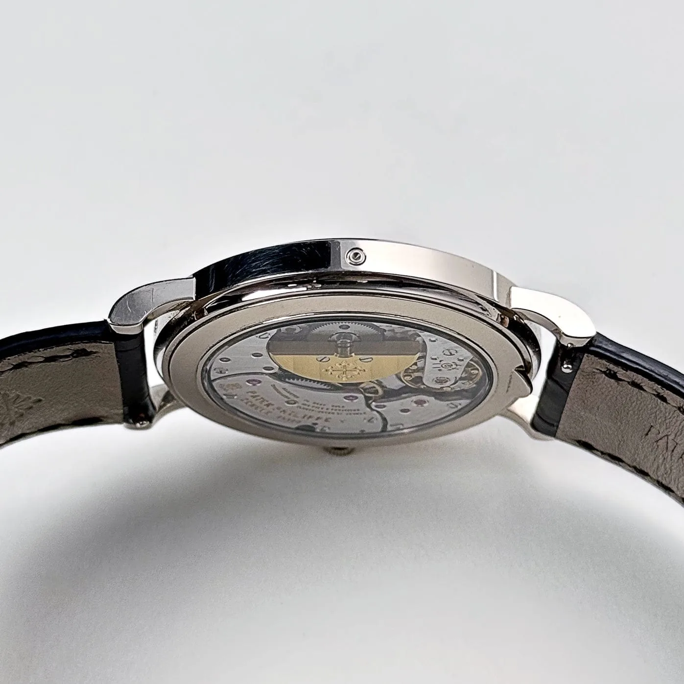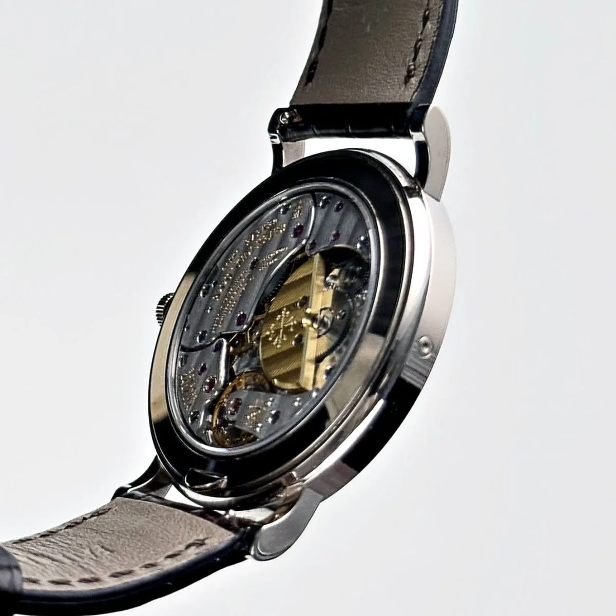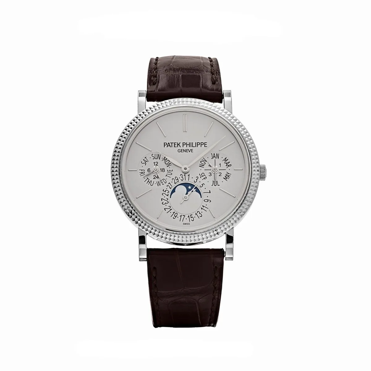 The Patek Philippe Grand Complications 5139G-001 Perpetual Calendar in white gold with a silver dial is a refined timepiece that combines classic elegance with advanced horology. The white gold case complements the subtle silver dial, which features a full perpetual calendar complication, offering precise tracking of the date, day, month, and moon phase. This model is highly sought after for its rarity and exceptional craftsmanship, making it a coveted piece for collectors who value both precision and timeless design.