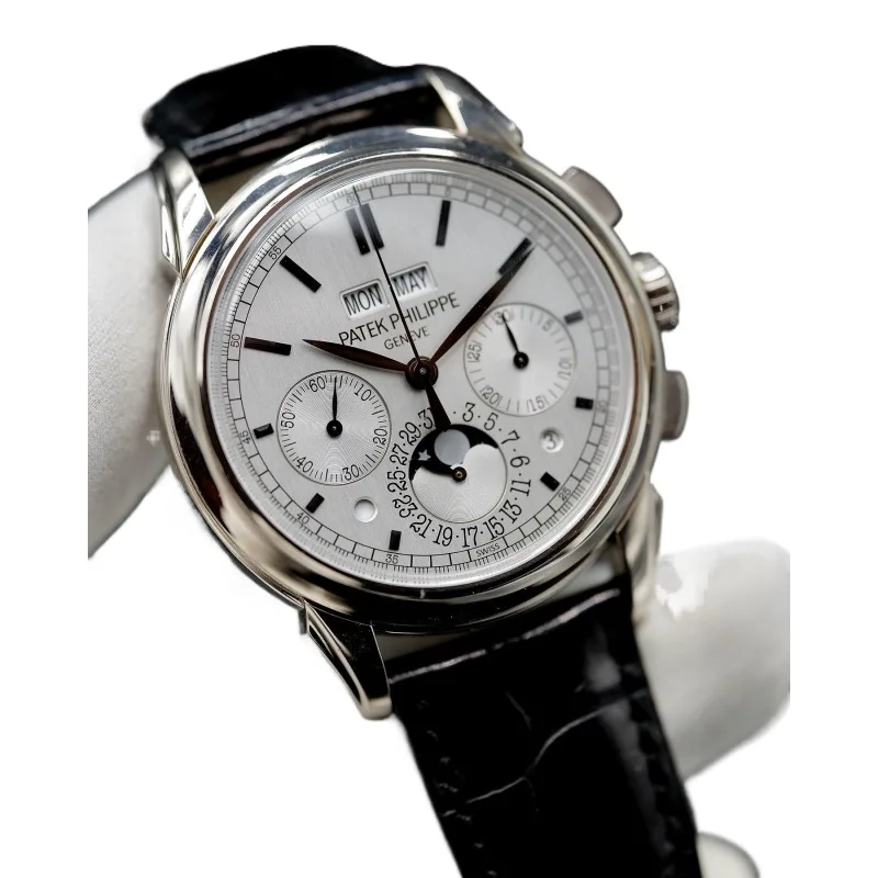The Patek Philippe Grand Complications 5270G-001 is a timeless expression of horological sophistication, showcasing the mastery of perpetual calendar functionality in an elegant design. The 41mm case, crafted in 18k white gold, exudes refinement with its polished surfaces and carefully contoured lugs, embodying Patek Philippe’s commitment to understated luxury.