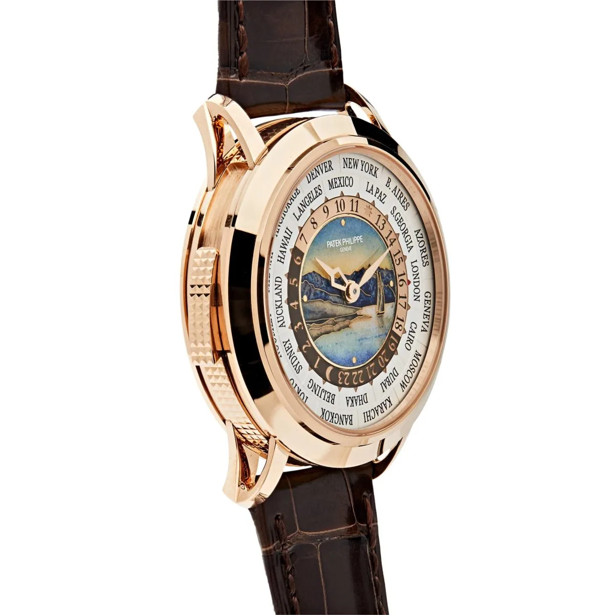 As the first minute repeater that always strikes local time (a patented mechanism), the World Time Minute Repeater unites two of Patek Philippe’s most emblematic Grand Complications. The rose gold 40.2mm case is adorned with a hand-guilloched hobnail pattern and a dial center in cloisonné enamel depicting the Lavaux vineyards on the shores of Lake Geneva as well as a 18k gold dial plate and 24-hour ring. It is humidity and dust protected only (not water resistant). This timepiece comes on a brown alligator strap with square scales, hand-stitching and a fold-over clasp.