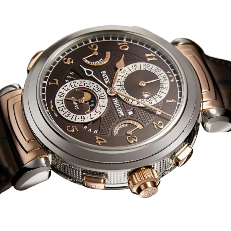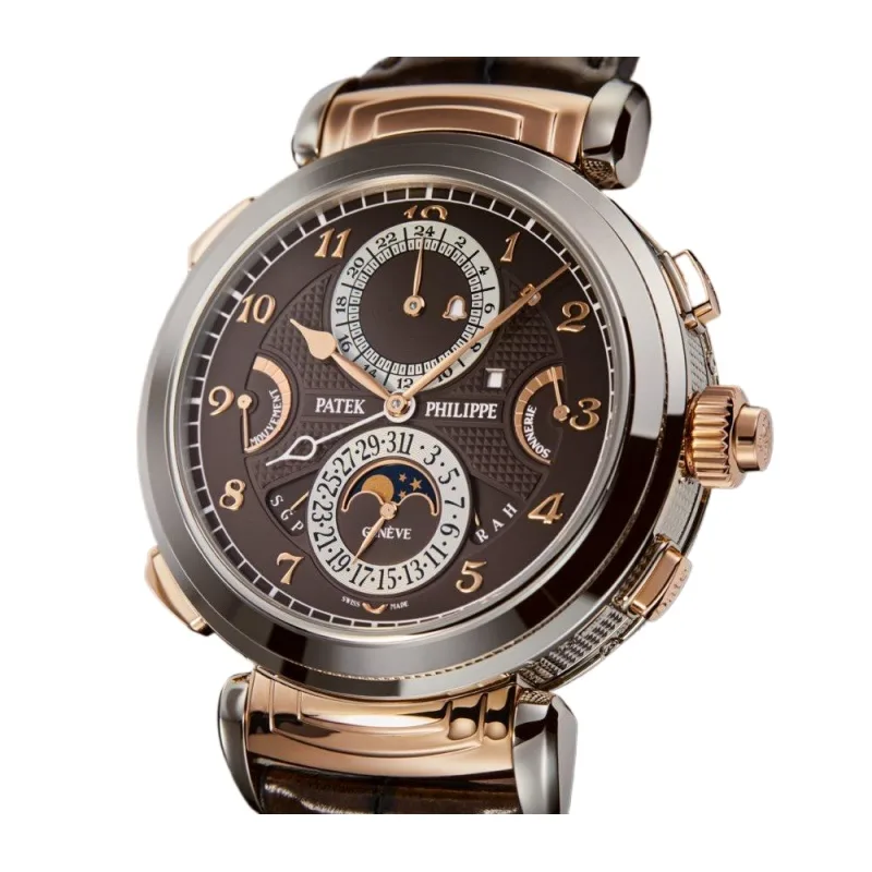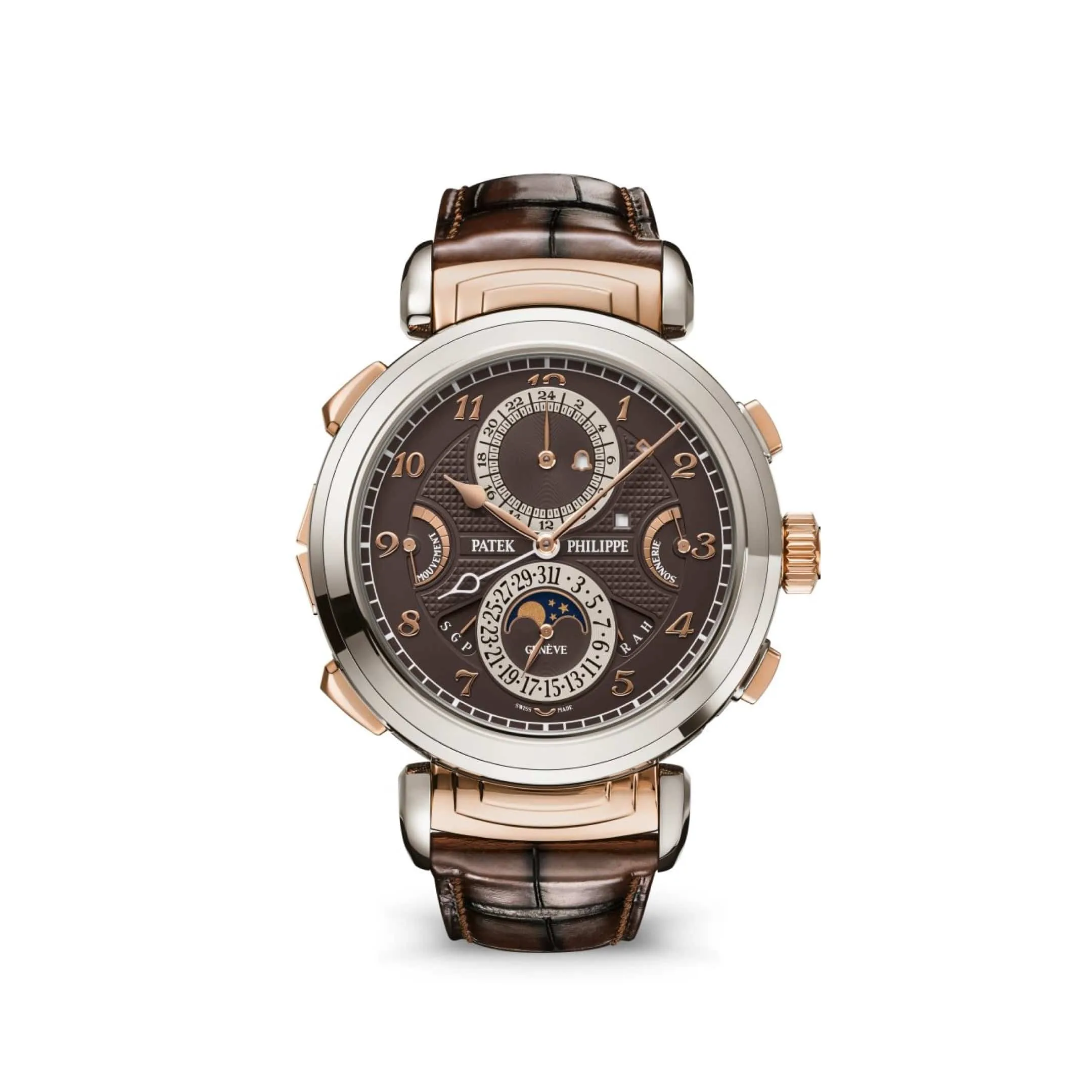 The Patek Philippe Grand Complications Grandmaster Chime 6300GR-001 is crafted in a 47.7mm, two-toned rose gold and white gold case and styled on a leather strap. Highly complicated, the watch features over 20 complications shared between the dual-faced dials. From Grande and petite sonnerie to perpetual calendar timekeeping, this watch is the jack of all trades.