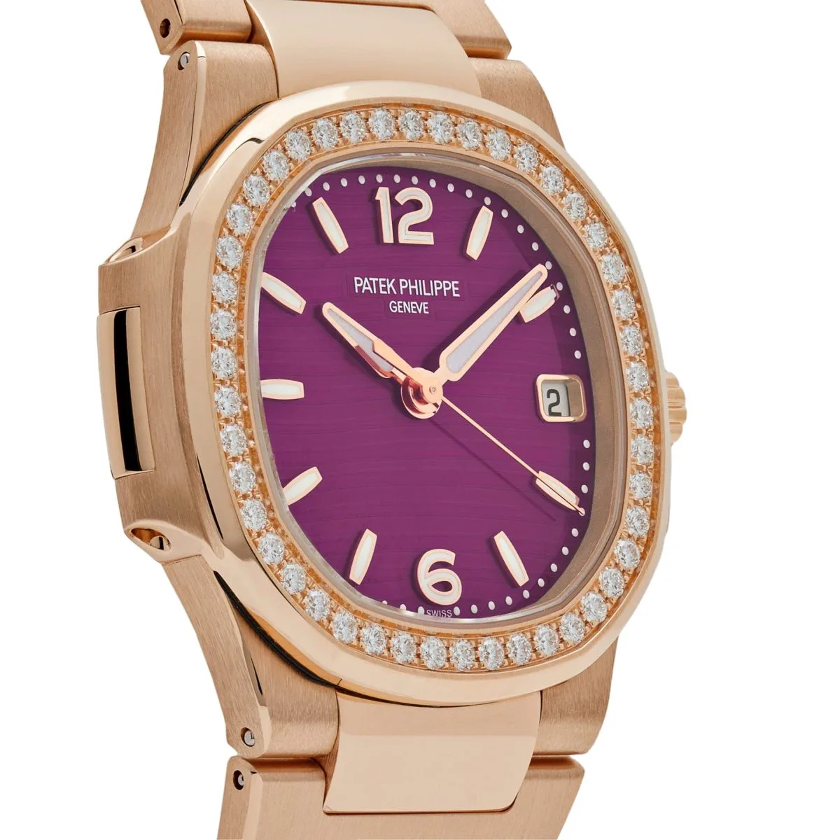 The bezel is adorned with 46 brilliant-cut diamonds (~0.73 carats), offering a luxurious sparkle that complements the rich purple dial. The dial features the iconic horizontal embossing of the Nautilus line, accented by rose gold-applied hour markers and luminescent-coated hands for excellent legibility. A discreet date window at 3 o’clock adds functionality to the design.