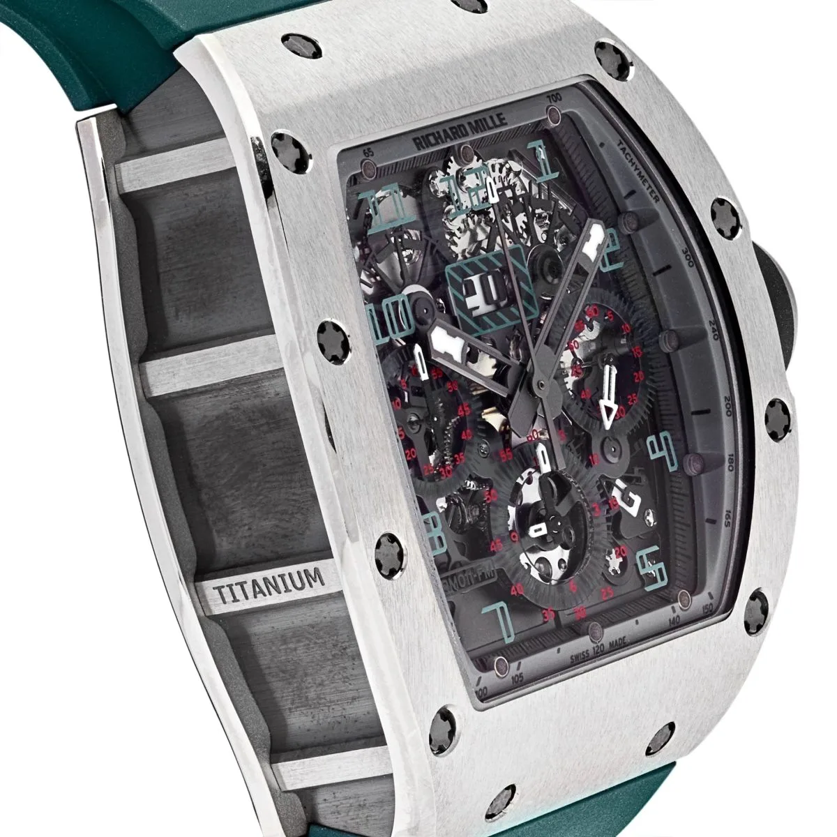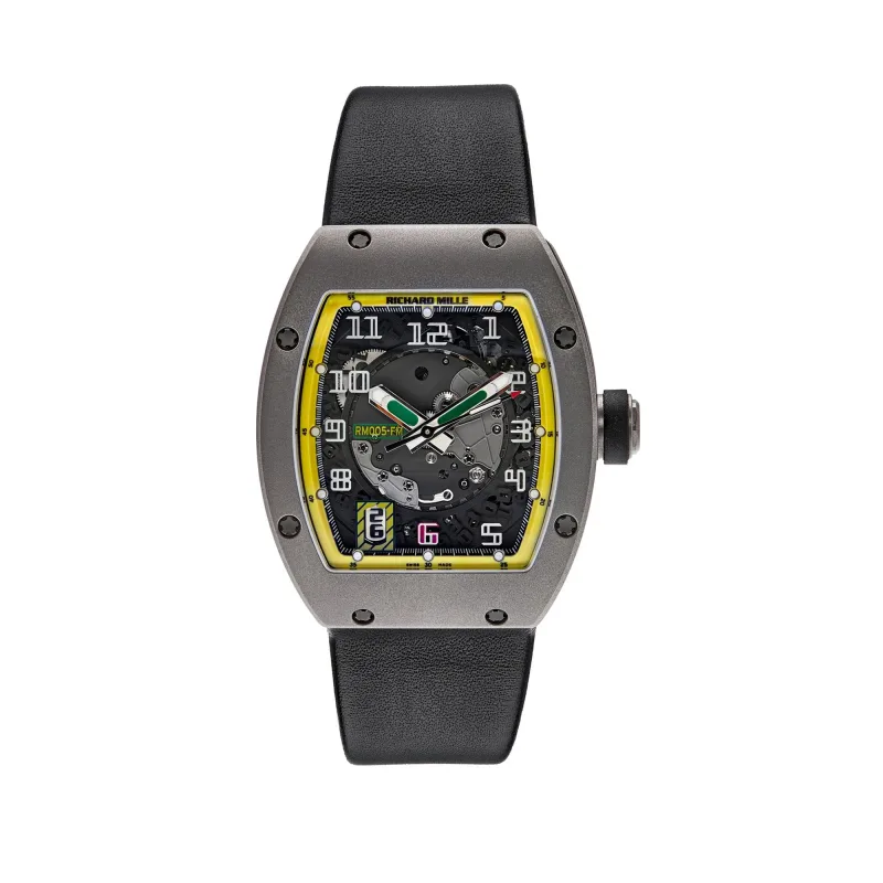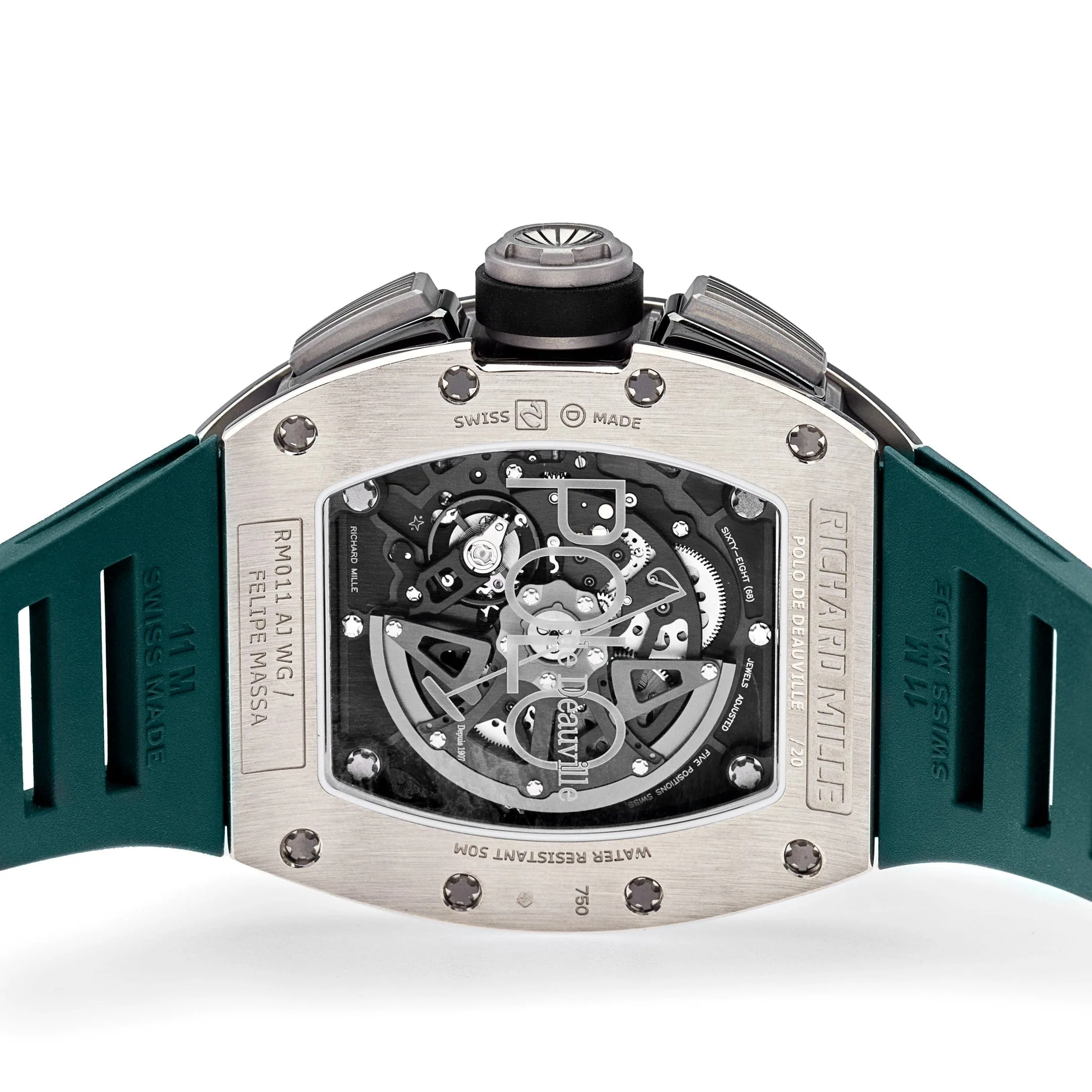 The Richard Mille RM 11-01 FM ‘Polo de Deauville’ is an exclusive edition that combines sporty elegance with high-performance engineering. Featuring a striking combination of white gold and titanium, the tonneau-shaped case measures 50mm x 42.7mm and showcases a mix of polished and satin-brushed finishes. The lightweight titanium ensures durability and comfort, while the white gold elements elevate the watch’s luxurious appeal.