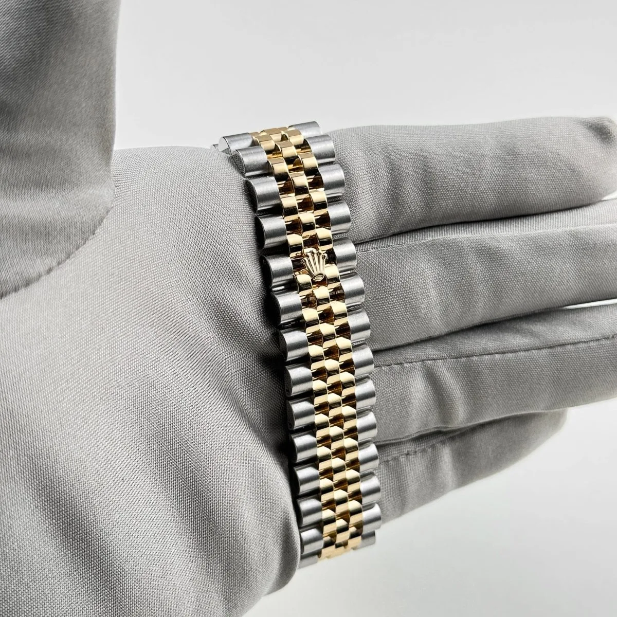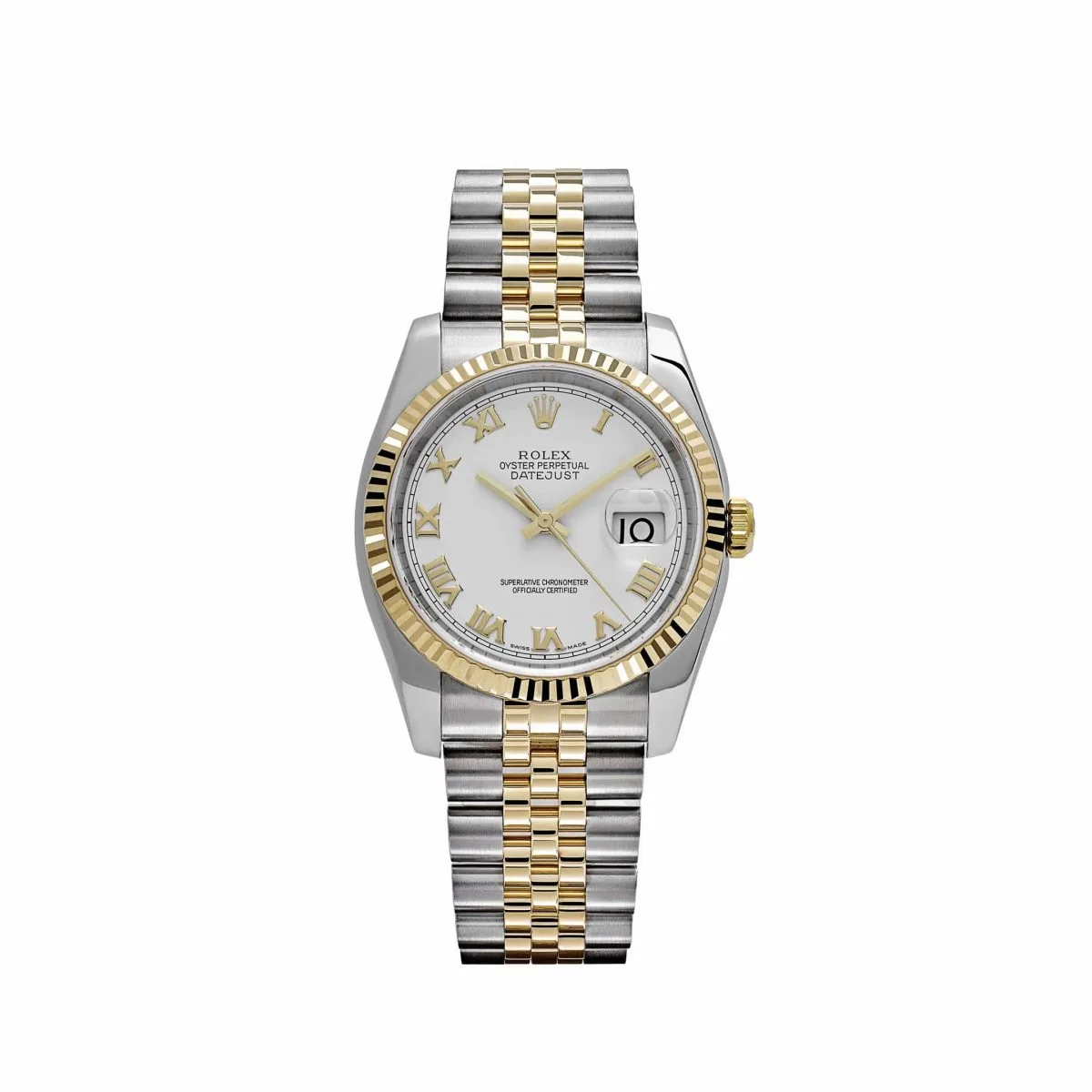 The crisp white dial is adorned with bold Roman numeral hour markers, creating a classic and sophisticated look. The date display at 3 o’clock, magnified by the Cyclops lens, ensures practicality and ease of use. The watch is paired with the Jubilee bracelet, combining comfort with style, featuring yellow gold center links and stainless steel outer links. Powered by the reliable Rolex self-winding movement, the 116233 is a perfect choice for collectors and enthusiasts seeking a versatile, luxurious, and enduring timepiece.