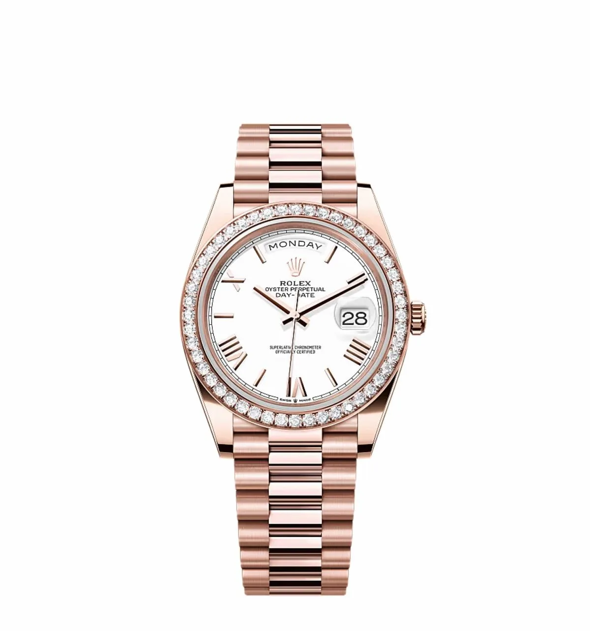 The Rolex Day-Date 228235 is an elegant expression of luxury, meticulously crafted in 18k rose gold for a warm and sophisticated aesthetic. Its 40mm case is elevated by a stunning diamond-set bezel, adding a touch of brilliance and exclusivity. The clean white dial enhances the watch’s timeless appeal, featuring bold Roman numeral hour markers in rose gold that provide a harmonious and refined look.
